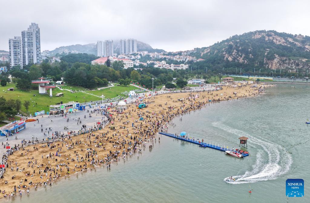An aerial drone photo taken on Oct. 5, 2025 shows people visiting a seashore park in Lianyungang City, east China's Jiangsu Province. Tourist destinations across China are witnessing a surge in visitors as the country's eight-day National Day and Mid-Autumn Festival holiday began on Wednesday. (Photo by Wang Jianmin/Xinhua)