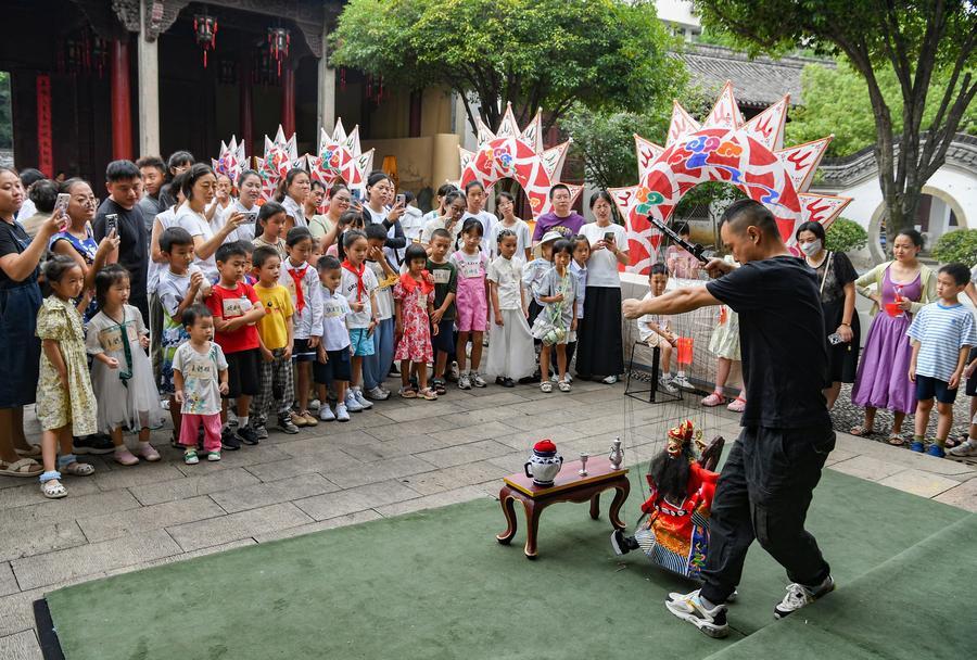 Tourists watch a string puppetry show in Jinhua City, east China's Zhejiang Province, Oct. 1, 2025. (Photo by Shi Kuanbing/Xinhua)