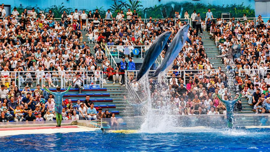 Tourists enjoy performance at an ocean park in north China's Tianjin, Oct. 4, 2025. (Photo by Du Penghui/Xinhua)