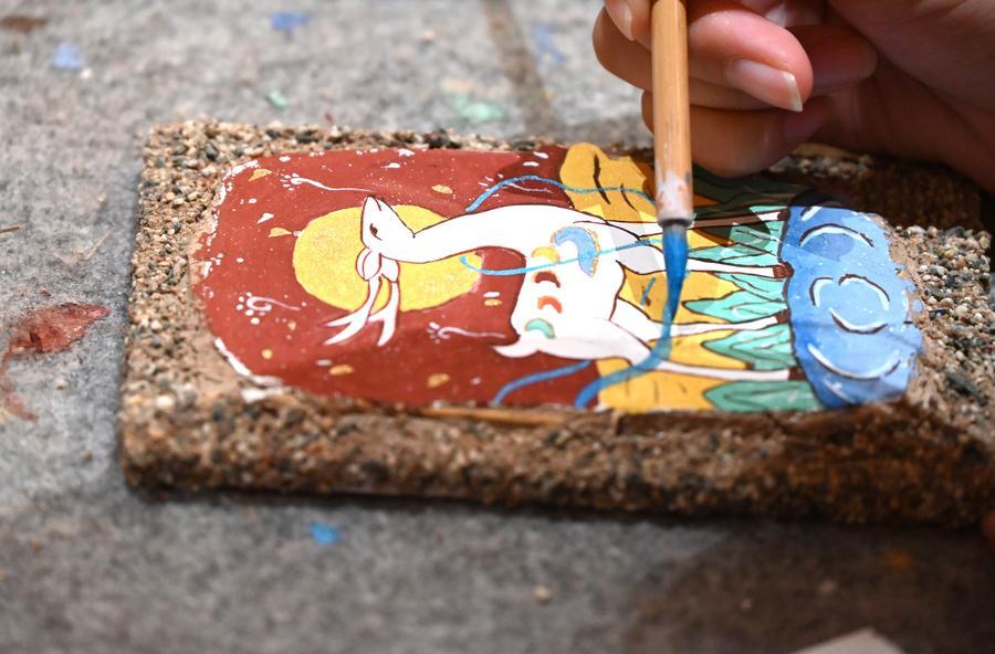 A tourist learns to draw mural patterns at a Dunhuang culture experience center in Dunhuang, northwest China's Gansu Province, Oct. 4, 2025. (Photo by Zhang Xiaoliang/Xinhua)