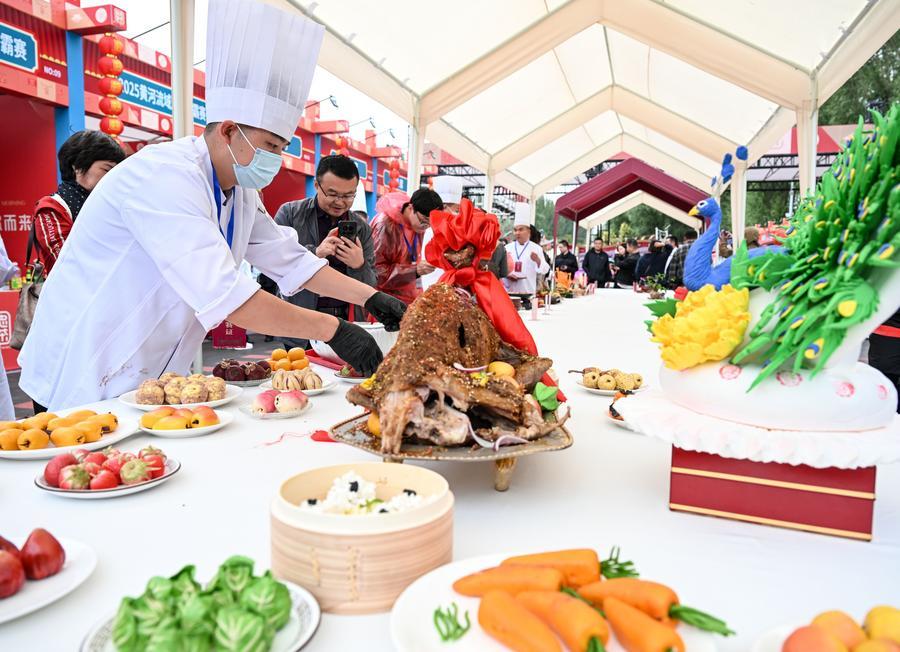 A chef prepares dishes for tourists during a culinary competition at a morning-tea food culture festival in Wuzhong City, northwest China's Ningxia Hui Autonomous Region, Oct. 1, 2025. (Xinhua/Feng Kaihua)
