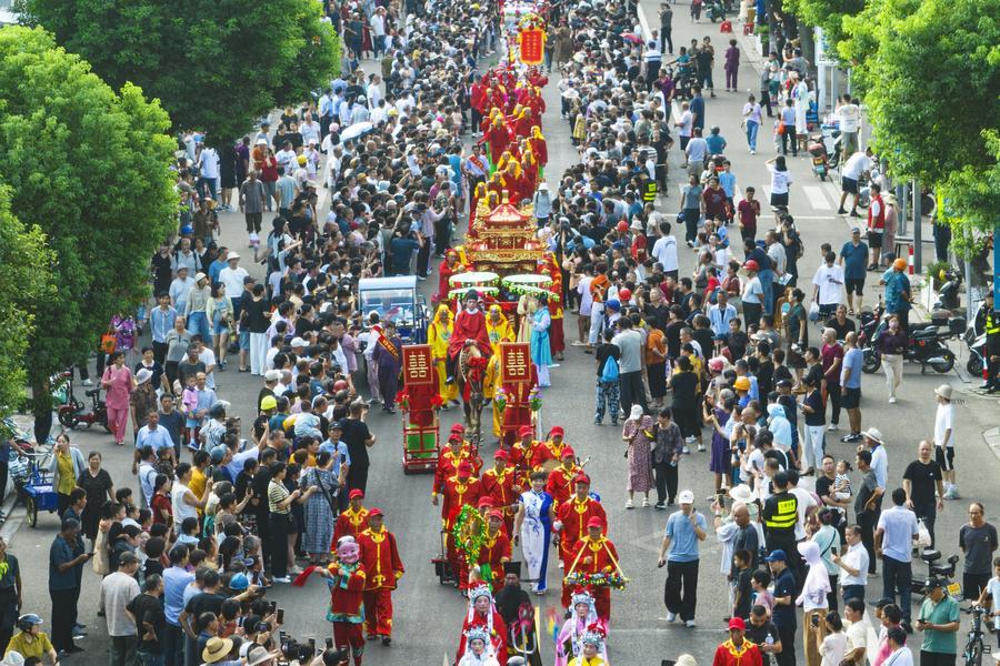 An aerial photo taken on Oct. 6, 2025 shows performers in traditional costumes during a parade in Ningbo, east China's Zhejiang Province. (Photo by Zheng Kaixia/Xinhua)