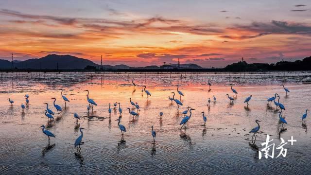 日落时分的广东中山南朗镇崖口村,白鹭立滩涂,晚霞染天际,自然绘就绝美共生画 。南方+拍客 梁嘉俊 摄