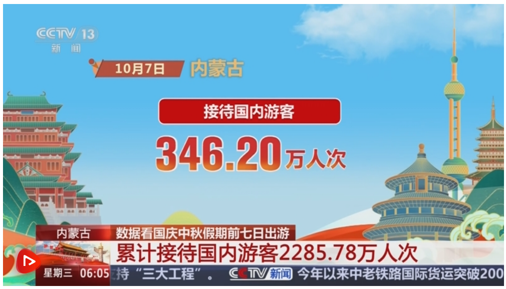 记者从内蒙古自治区文化和旅游厅了解到,7日,内蒙古接待国内游客346.20万人次。假期前七天,内蒙古累计接待国内游客2285.78万人次;实现国内游客总花费160.66亿元。各景区内的木屋、露营地、帐篷酒店等住宿设施备受青睐,假期期间预约满额,呈现火爆场景。