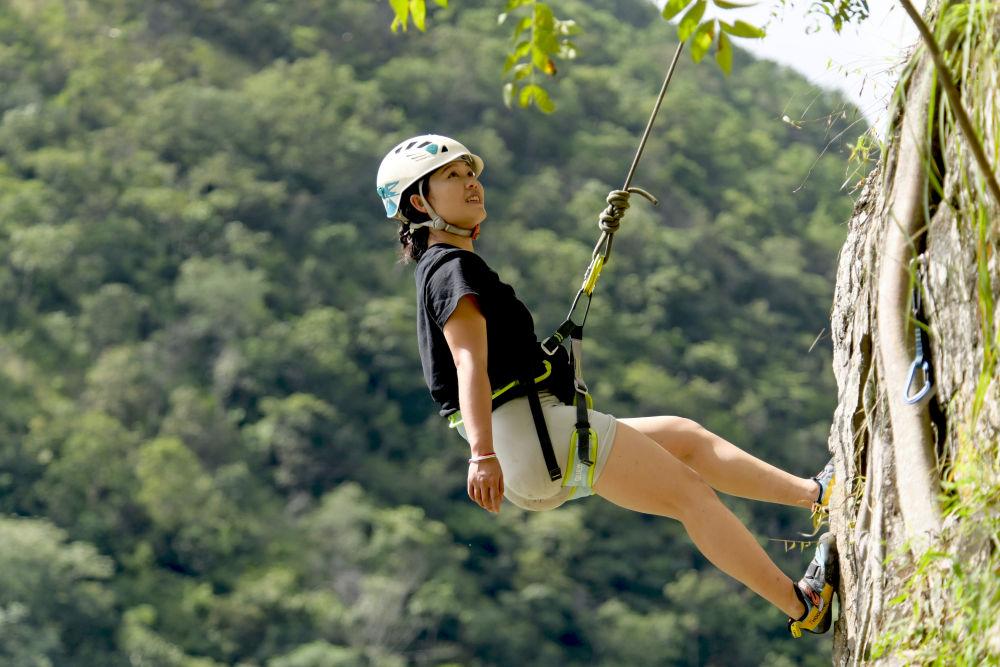 10月4日,游客在云南大理南涧彝族自治县公郎镇猛龙渡体验“攀岩”运动。新华社发(适志宏摄)