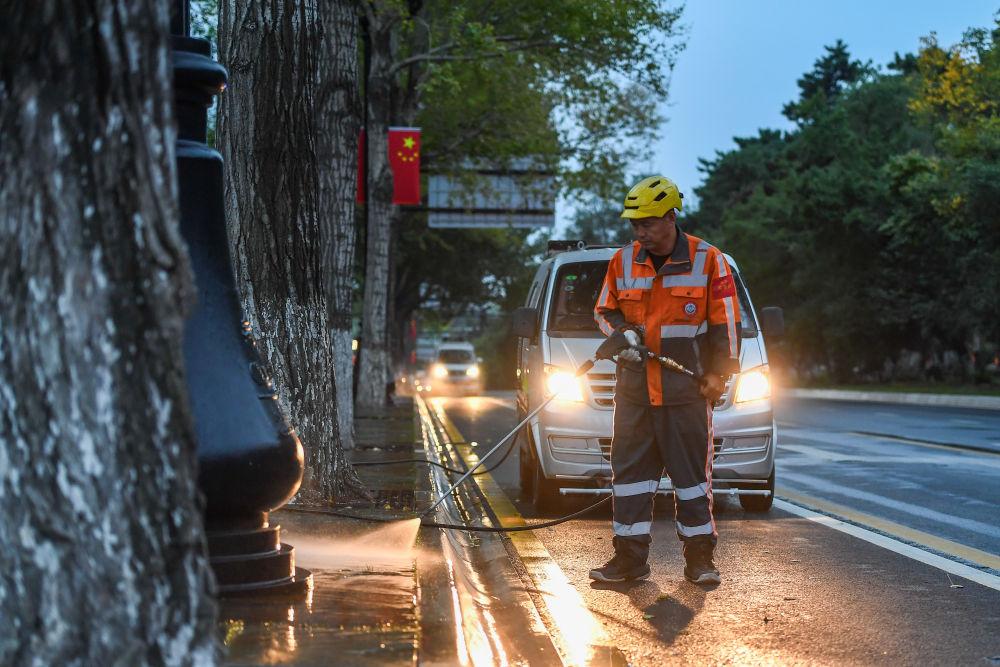 10月1日,环卫工人在吉林省长春市朝阳区新民大街清扫人行步道。新华社记者 张楠 摄