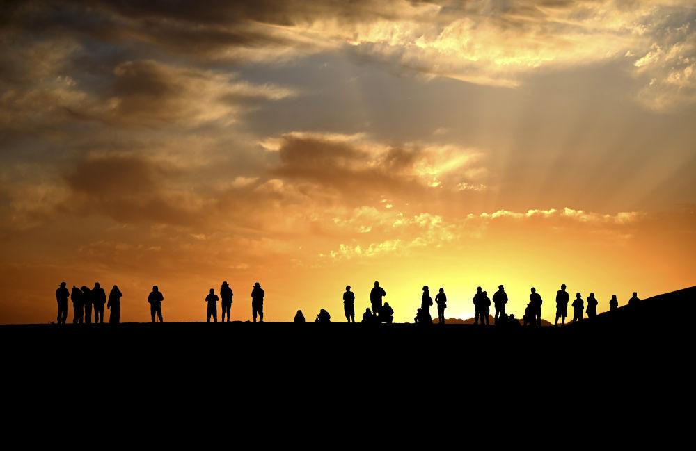 这是10月2日清晨,游客在甘肃省敦煌市鸣沙山月牙泉景区观赏大漠日出美景。新华社发(张晓亮 摄)