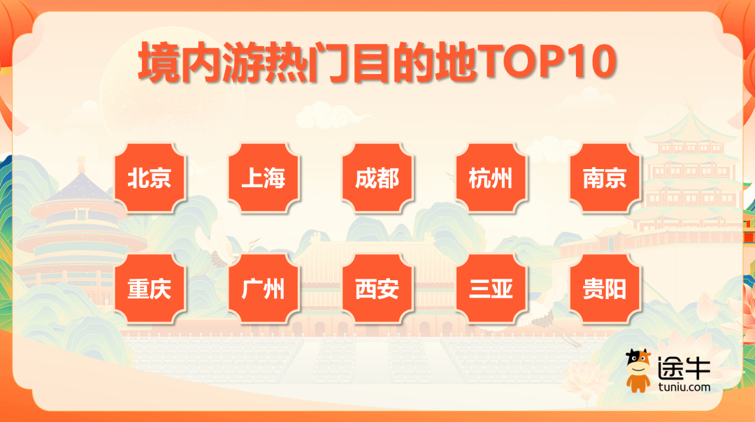 今年国庆中秋假期,北京、上海、成都、杭州、南京、重庆、广州、西安、三亚、贵阳等目的地热度排名靠前,位列途牛用户2025国庆中秋假期“境内游热门目的地榜单”前列。