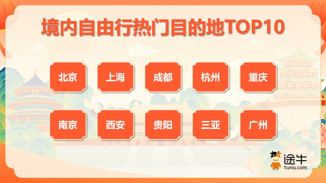 境内自由行热门目的地中,北京、上海、成都、杭州、重庆、南京、西安、贵阳、三亚、广州热度排名靠前。