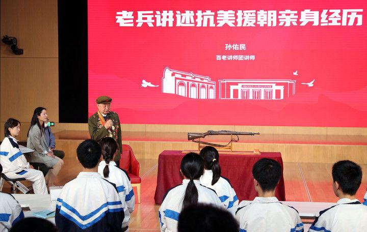 2021年10月25日,老兵代表在上海中学的课堂上讲述抗美援朝的亲身经历。这堂特别的思政课是中共一大纪念馆“百物进百校,百讲证百年”活动的第一讲,纪念馆从馆藏中精选100件革命文物,带进学校课堂,以“文物进校园”的形式,用好用活红色资源,赓续红色血脉。