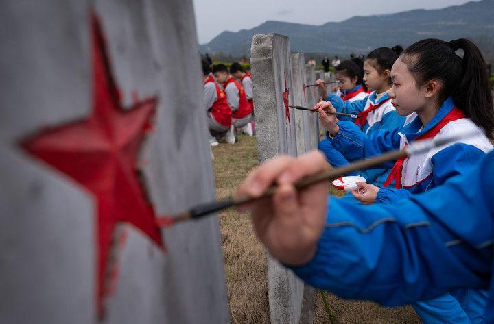 2025年3月31日,在四川川陕革命根据地红军烈士陵园,红军小学学生为无名烈士墓碑上的五角星描红。当日,来自四川通江县的300名中小学青少年代表,齐聚川陕革命根据地红军烈士陵园,在庄严肃穆的仪式中开启了一堂“纪念碑下的思政课”,为埋葬在这里的25048名红军烈士寄去哀思。