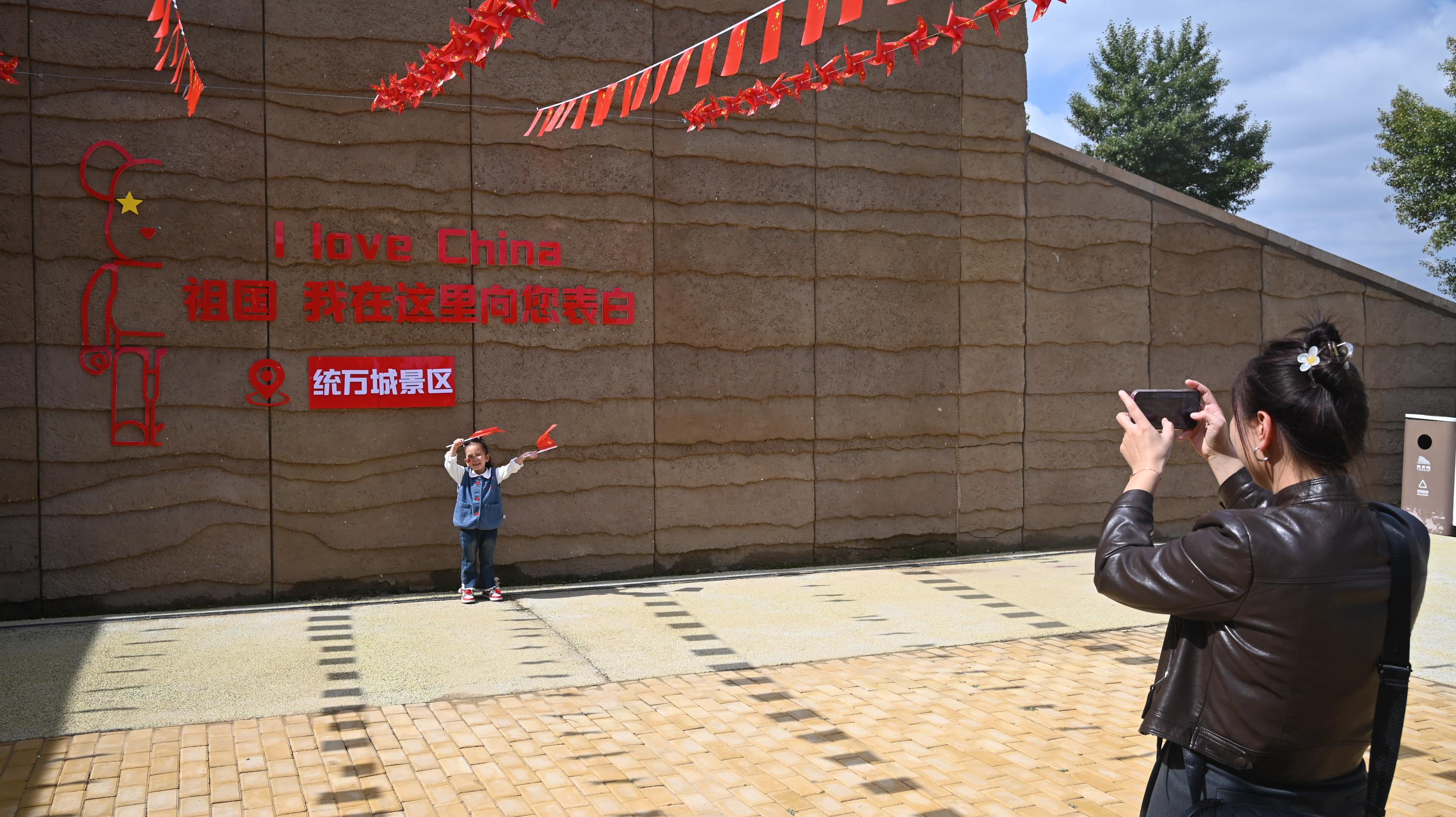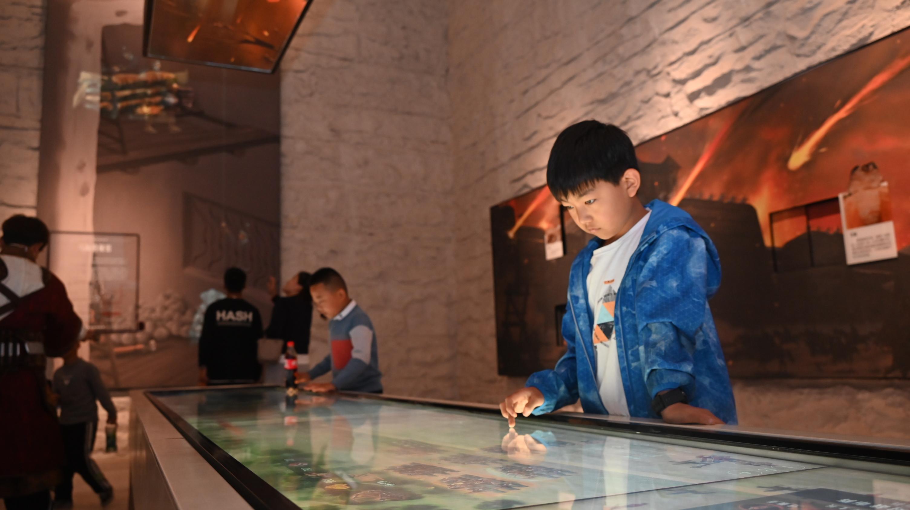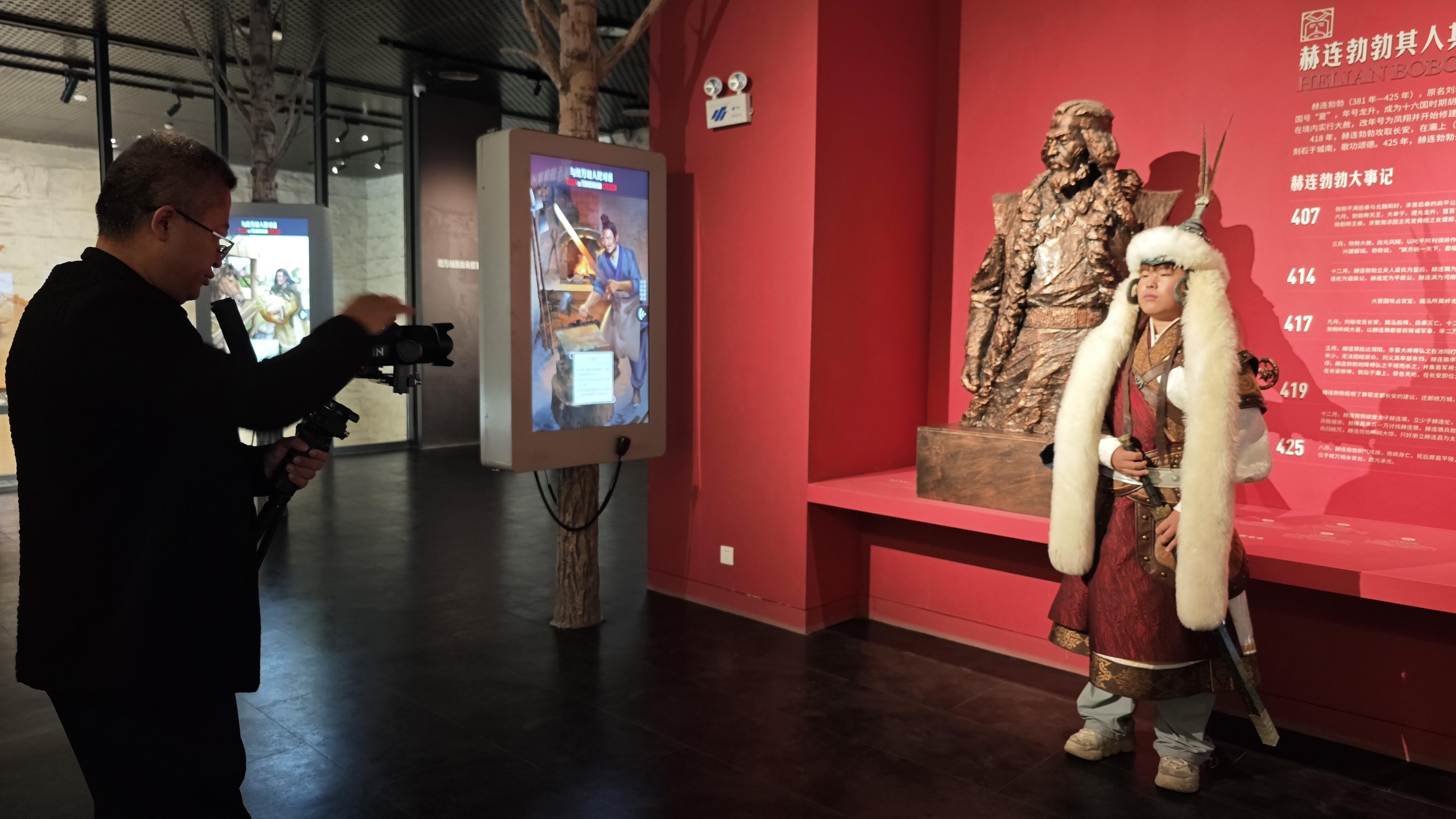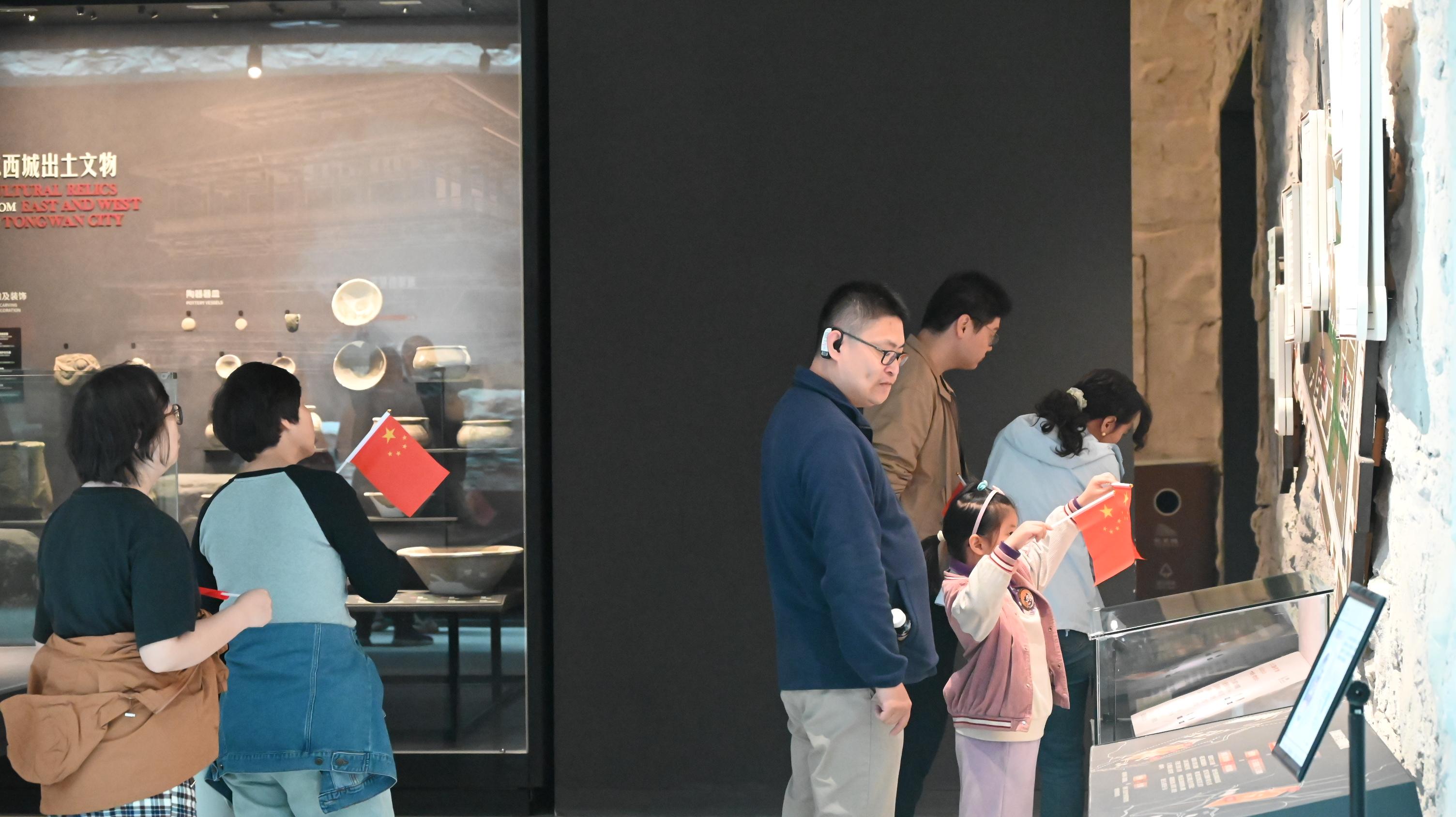 馆内的蔡文姬、霍去病、赫连勃勃等演员的沉浸式演艺,更让历史有了“温度”。身着古装的演员在复原模型前演绎赫连勃勃建城的传奇,秋风拂动衣袂,仿佛将千年故事娓娓道来,游客穿行其间,宛如随秋风穿越时空,与历史人物隔空对话。非遗展演同样氛围感满满:陕北说书传承人怀抱三弦,琴声伴着秋风传向远方,弹唱古今变迁;陕北民歌歌手以高亢嗓音演绎黄土风情,歌声与风声交织,满是质朴热情。不少家庭还参与了“我爱祖国”专题打卡,国风潮流在爱国歌曲中绽放别样光彩。来自广东珠海的吴兰感慨:“统万城的风里都带着历史的味道,青铜器展让人读懂文明,非遗表演让人爱上这片土地,这样的国庆体验太特别了!”