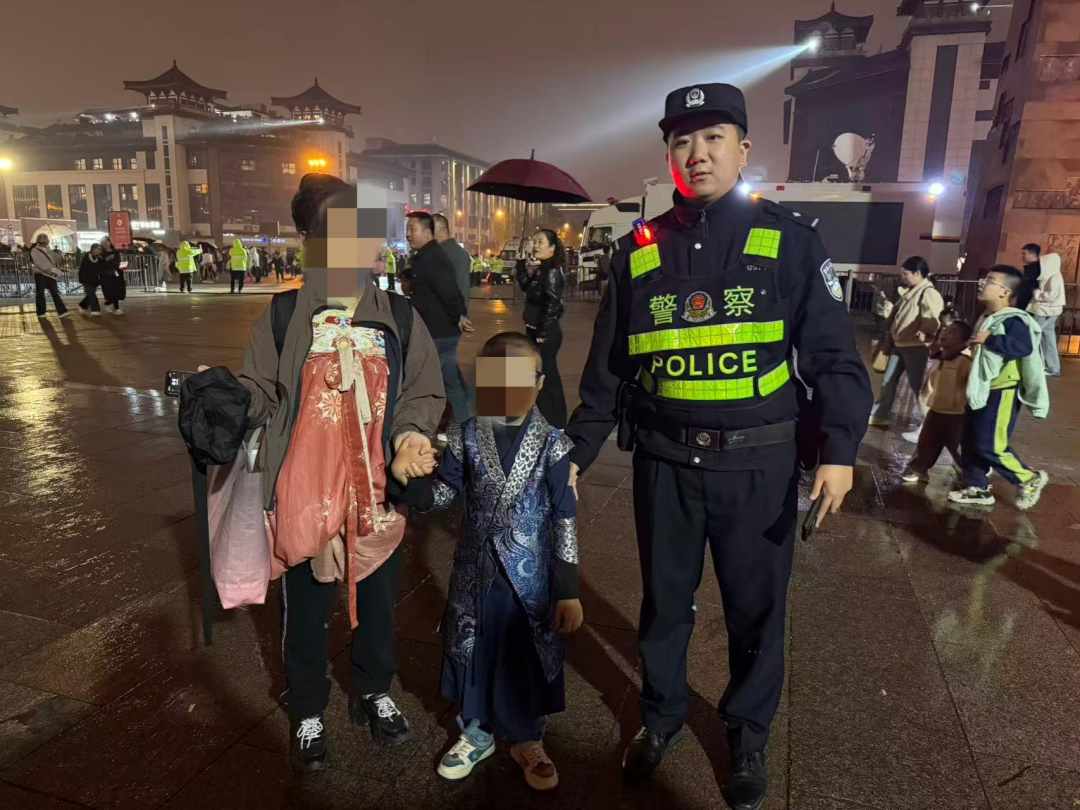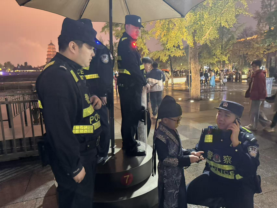 同样的守护也出现在大雁塔景区。10月6日,正在景区执勤的北杜派出所民警,在熙攘人流中发现一名与家人走散的小男孩正站在路边无助哭泣。