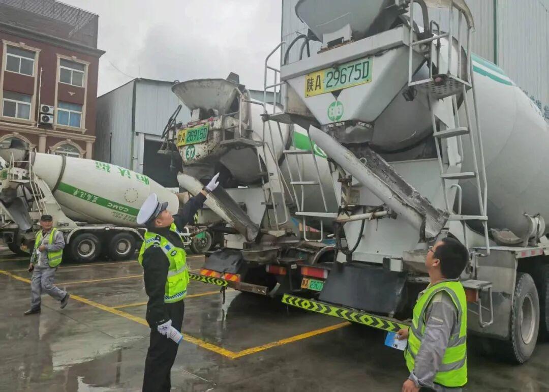 在检查环节,民警深入企业停车场,对停放在场内的混凝土搅拌车、罐式运输车等重点车辆进行了“过筛式”检查,详细查看了车辆的制动系统、轮胎磨损状况、灯光信号装置以及反光标识、防护装置的完整性和规范性。