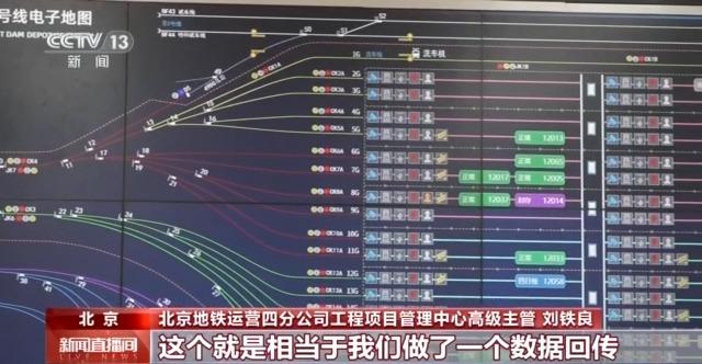 北京地铁运营四分公司工程项目管理中心高级主管 刘铁良:这个就是相当于我们做了一个数据回传,它是通过4G的专网把数据实时回传回来,所有故障信息全部都在系统里有。后台有一个服务器处理,再通过前端展示,绿色的小车都是它实时的位置,有状况会报警。