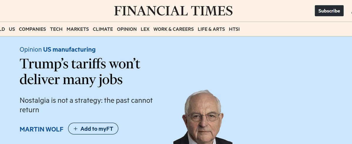 中国日报网10月10日电 英国《金融时报》副总编及首席经济评论员马丁·沃尔夫(Martin Wolf)8日发表评论文章称,事实表明,特朗普政府推行的贸易保护主义政策,并未兑现其对选民所作的核心承诺——为美国创造大量制造业就业岗位,尤其是面向那些曾经依赖传统工业、如今却面临地区经济衰落困境的工人群体。他进一步指出,这一承诺本质上是空洞的,其政策实质是为政府自身及其背后的富豪阶层牟取利益。