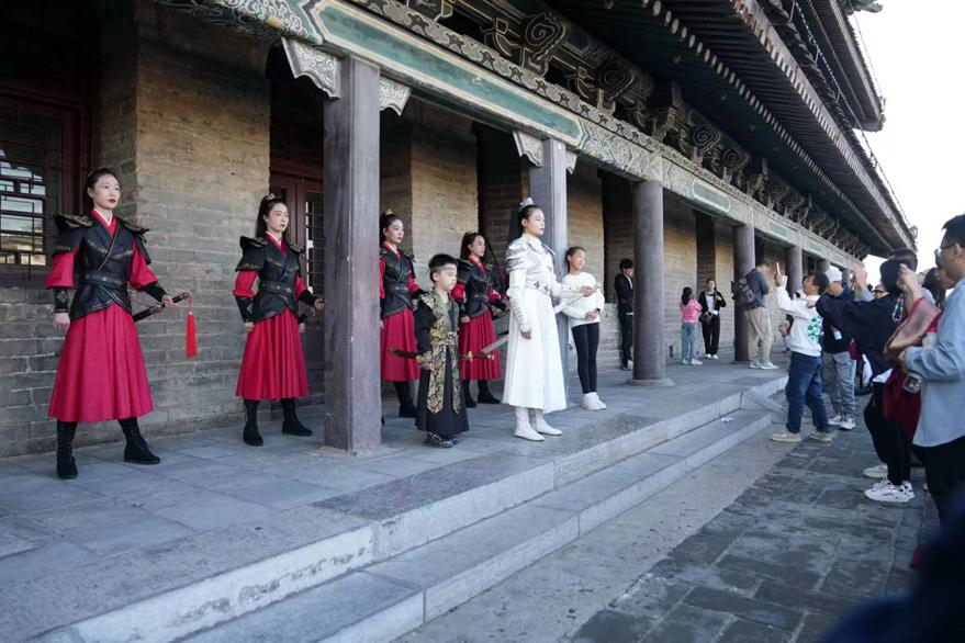 当游客在13座敌楼文化空间里沉浸于历史文化的魅力,流连忘返之际,西安城墙的各个门点又用精彩纷呈的各类文化演出奏响了另一曲活力乐章,焕发出别样的生机。这个假期,西安城墙景区巧妙地将金甲武士、机甲巡游、盛唐天团等景区IP融入国庆主题文艺汇演活动中。金甲武士身着璀璨铠甲,威风凛凛地巡游,引得游客纷纷驻足;国风机甲以科技感与古风相结合,带来一场视觉奇旅。与此同时,魁星楼处开启唐诗接力赛,随机抽诗句卡片对出下句,或于“西安城墙景区”抖音活动视频下留言原创诗句+城墙场景照,每日10份《梦长安-大唐迎宾盛礼》观演名额等您赢!此外,金甲武士巡游、大唐运动会、花钿