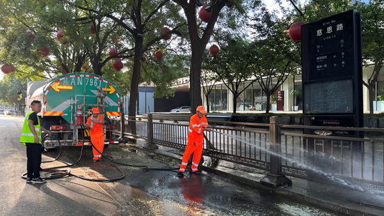 高新区城管局以商业街区、公园广场为重点,整治占道经营、车辆违停,指导规范国旗升挂。同时深入工地、商户排查户外广告、围挡安全隐患,加强低洼路段巡查,落实24小时值班与“零报告”制度,确保突发事件高效处置。
