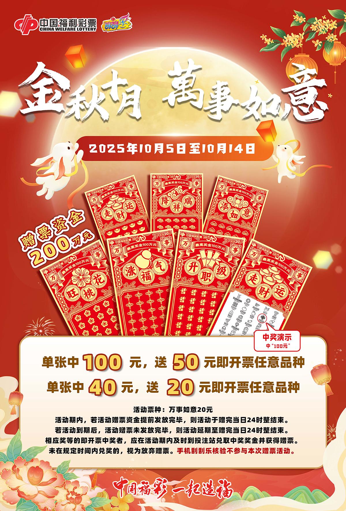 据悉,本次赠票回馈活动计划持续至10月14日,以新上市的“万事如意”20元即开票为载体。活动期间,彩民购买该票种中得指定奖等,即可获得相应赠票:单张活动彩票中得100元奖等,赠送50元任意品种即开票;中得40元奖等,赠送20元任意品种即开票。