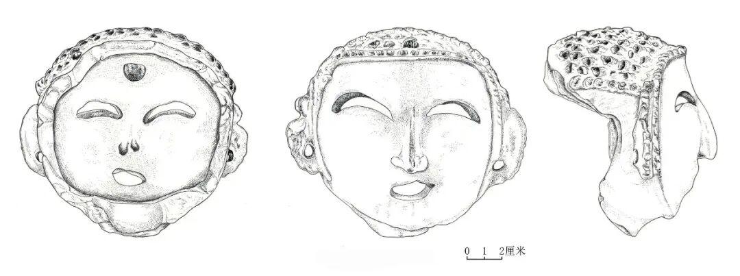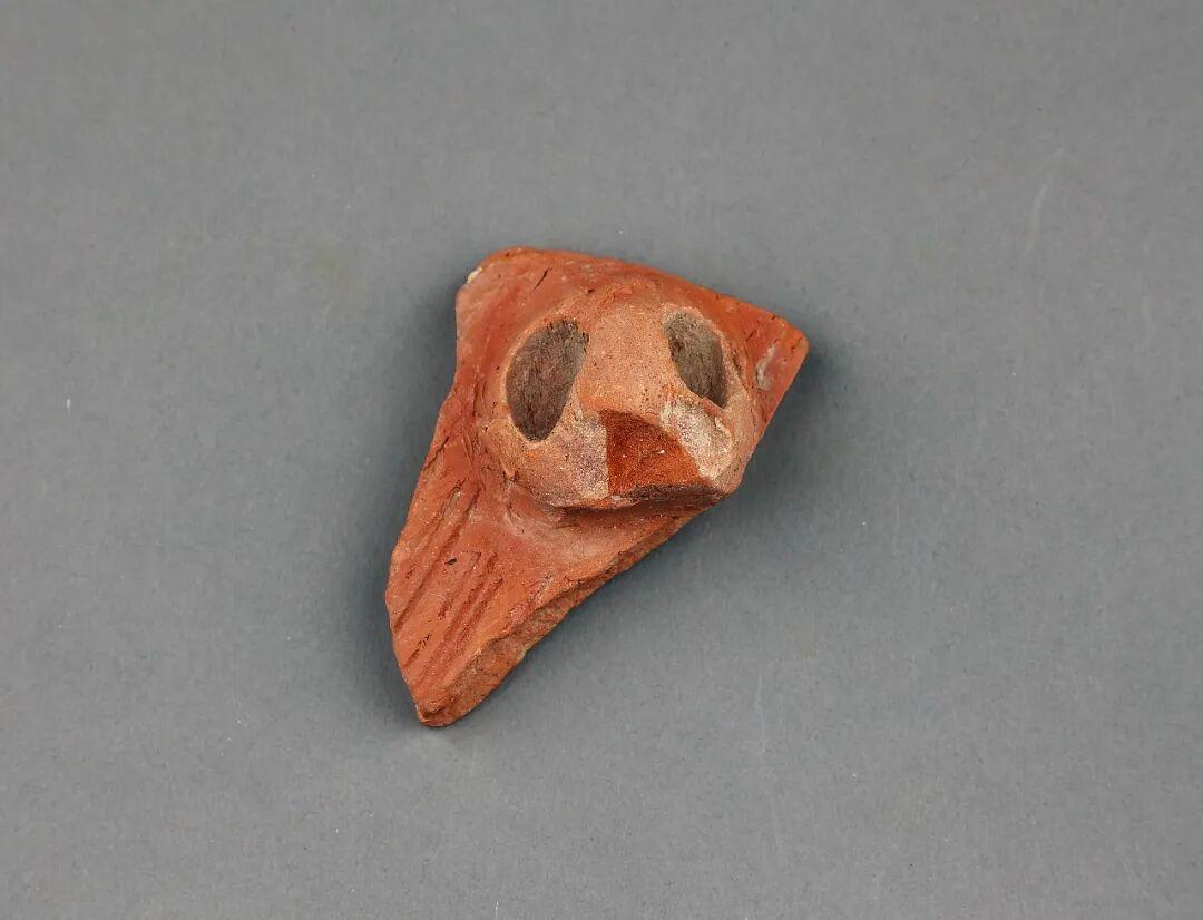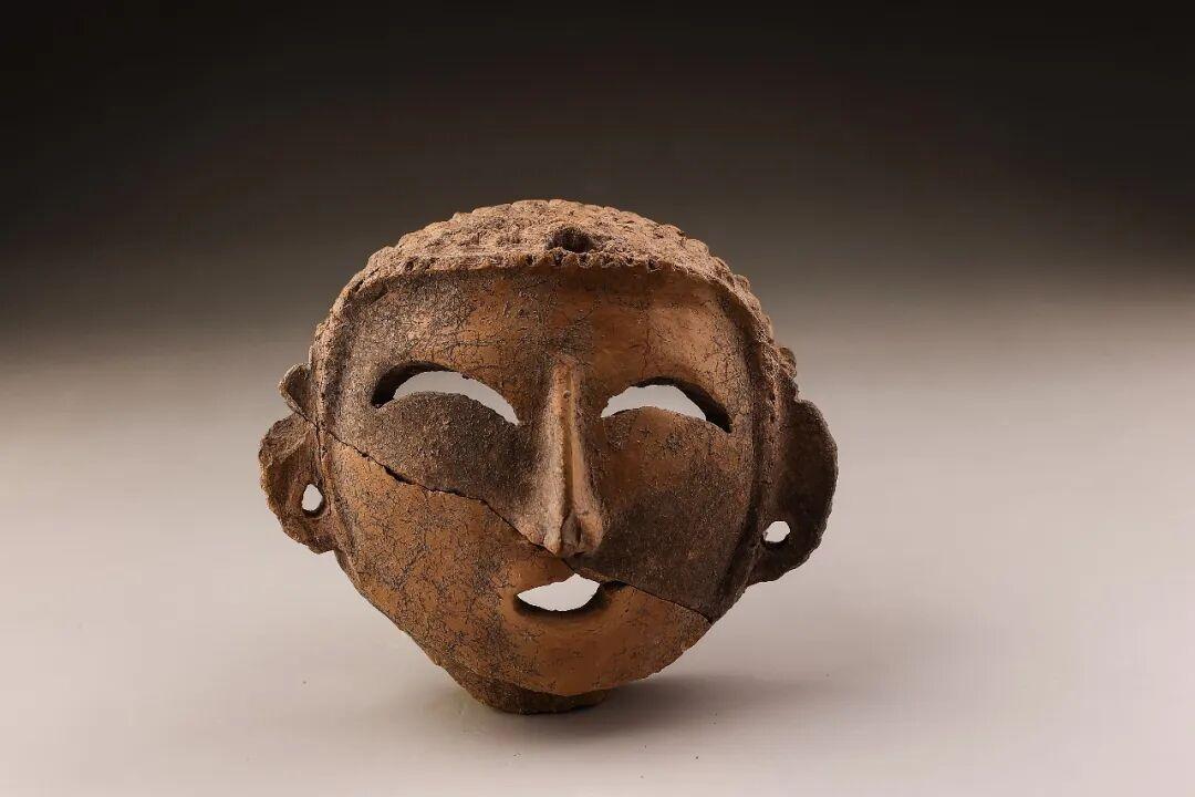 其为泥质红陶,加工精致,头顶饱满,从后向前以密集戳刺纹表示头发,额顶正中有穿孔,两鬓连至下颌。面部泥条盘筑,两眼镂空月牙形;鼻梁贴塑,挺直,略呈鹰钩状;口部镂空微张,呈微笑状;双耳扁平,贴于脸颊两侧,耳垂下方有穿孔耳洞;颈部中空,半弧形。