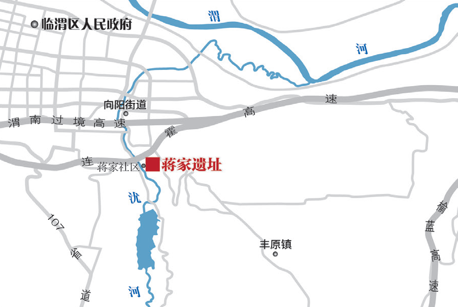 蒋家遗址位于渭南市临渭区向阳街道蒋家村东,地处沋河下游出秦岭的塬前坡地上,西临沋河川道,北距渭河干流5千米,南距秦岭约15千米。