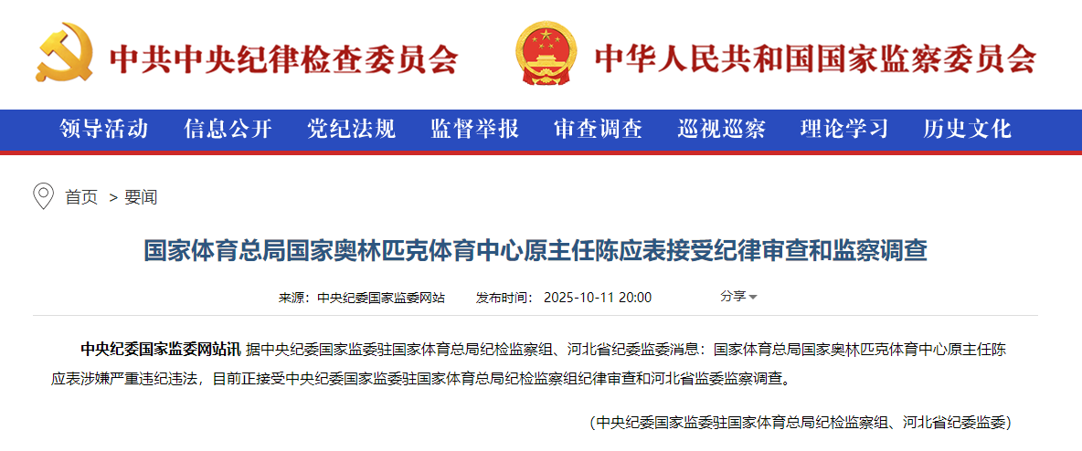 中央纪委国家监委网站讯 据中央纪委国家监委驻国家体育总局纪检监察组、河北省纪委监委消息:国家体育总局国家奥林匹克体育中心原主任陈应表涉嫌严重违纪违法,目前正接受中央纪委国家监委驻国家体育总局纪检监察组纪律审查和河北省监委监察调查。