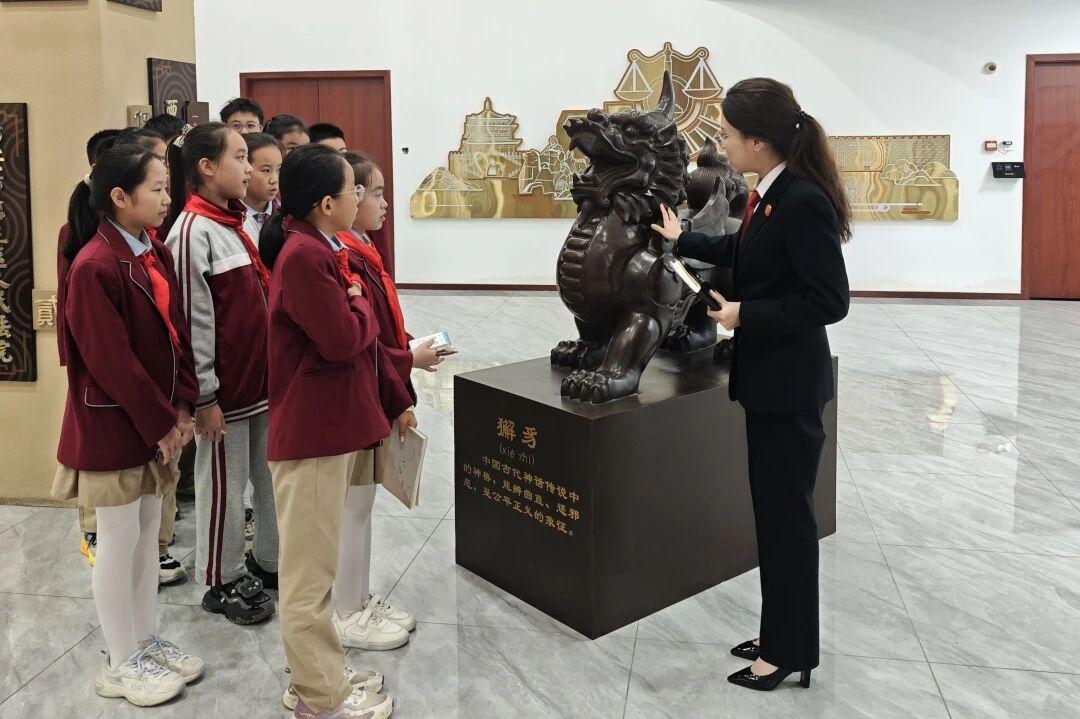 在法院一楼大厅,一尊造型独特的“獬豸”雕像吸引了同学们的目光。陈思含以“獬豸辨是非、断曲直”的传说为切入点,用生动有趣的语言阐释“公平正义”的法律精神:“獬豸会用角触碰不公正的人,就像法律会惩罚违法犯罪行为,保护好人的合法权益。”她提醒同学们:“在学校里,遵守校规校纪、尊重同学,就是维护‘小公平’;将来走进社会,遵守法律法规,就是维护‘大正义’,每个人都能成为‘小小獬豸’。”