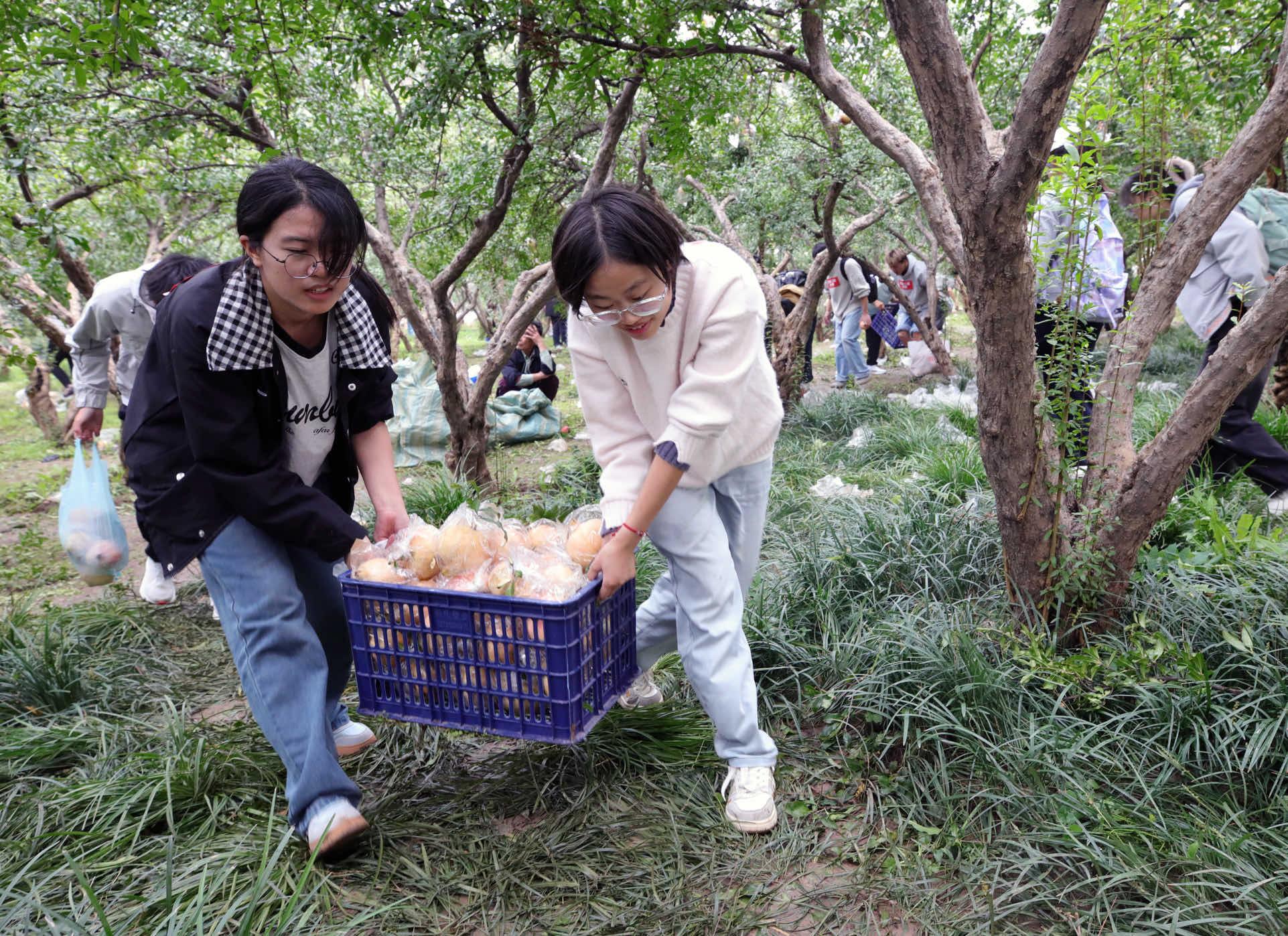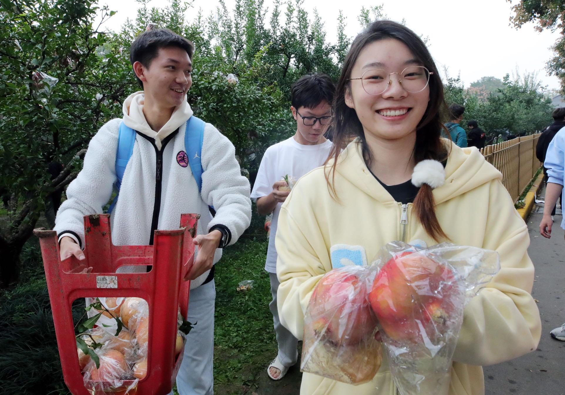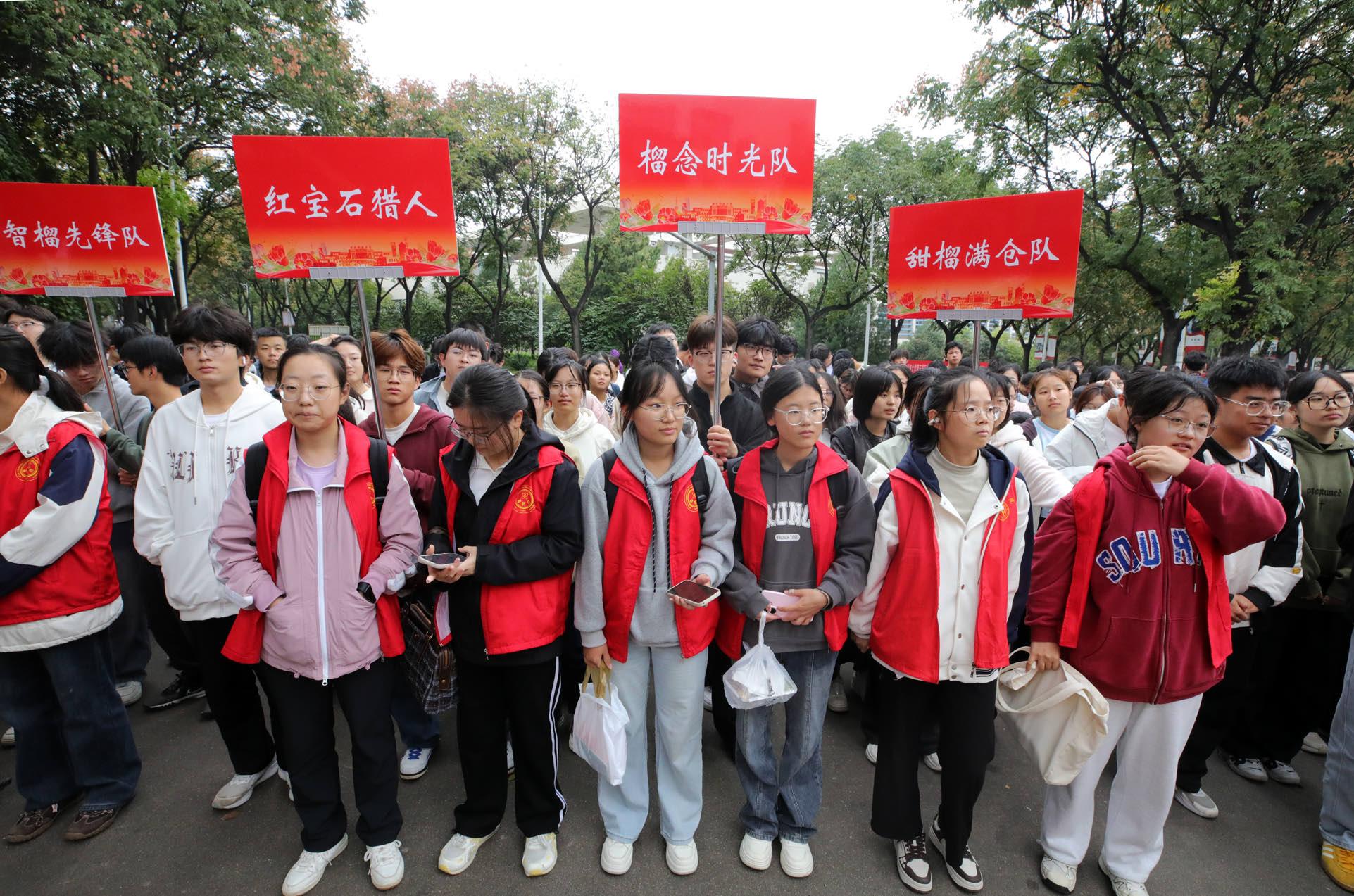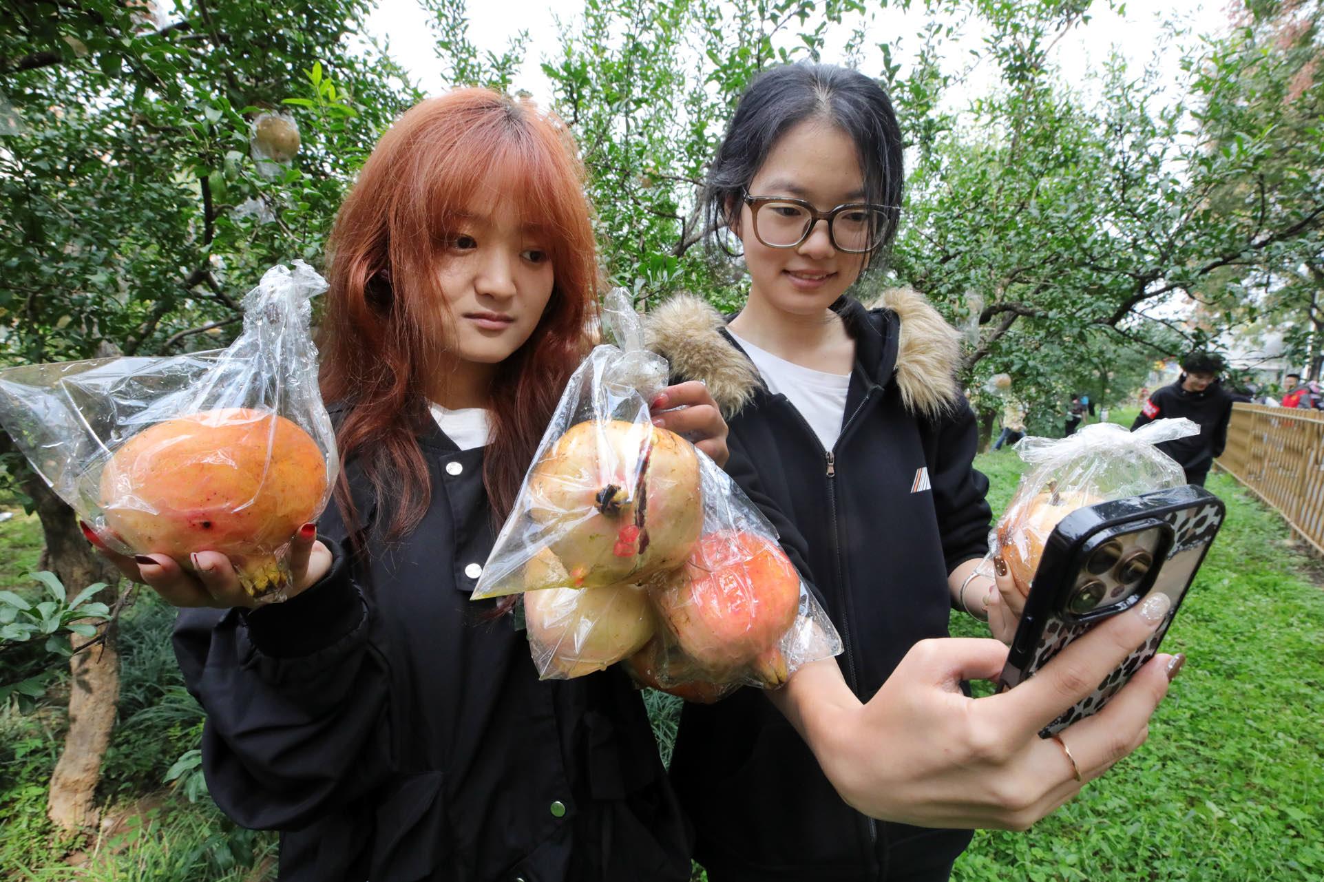 “甜榴满仓队”“石来运转小分队”“码上石榴香”……一个个生动有趣的队名,映衬着大学生们的热情与创意。16个学院代表队与16个班级代表队穿梭在石榴树下,尽管雨后园内泥泞,石榴套袋中积有雨水,但大家毫不在意,专注地采摘着枝头饱满的果实。机械工程学院大一新生孙柯一边小心翼翼地摘着石榴,一边兴奋地说:“我家在蒲城,摘过酥梨,但摘石榴还是第一次,这种体验太特别了!”他的同学杨伟奇则捧着刚摘下的两个“石榴王”,兴奋地表示要带给未到场的同学和老师,“也让父母看看我在学校的丰收喜悦!”