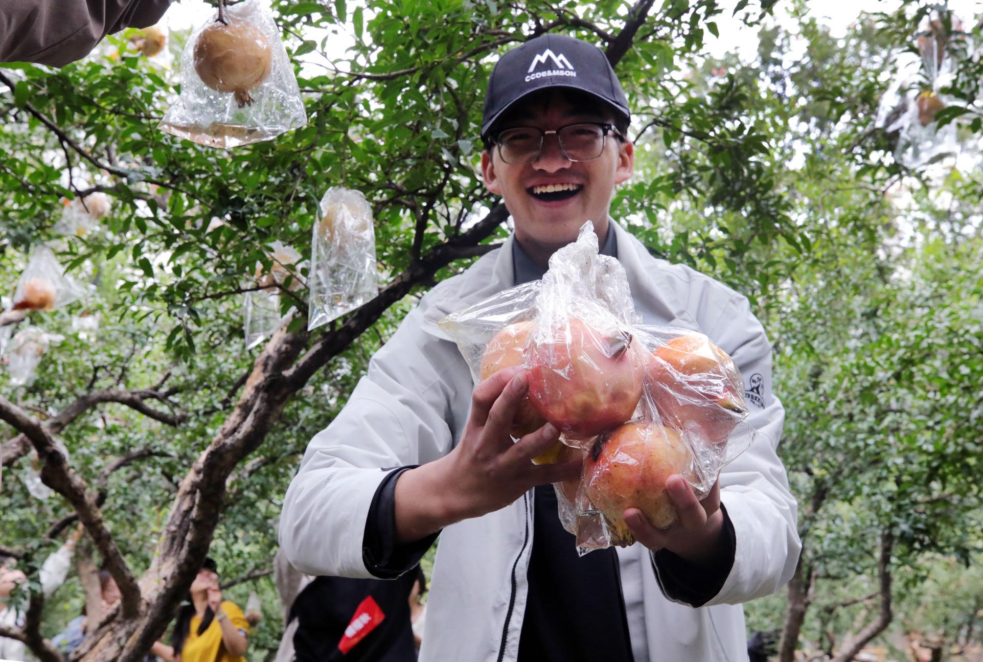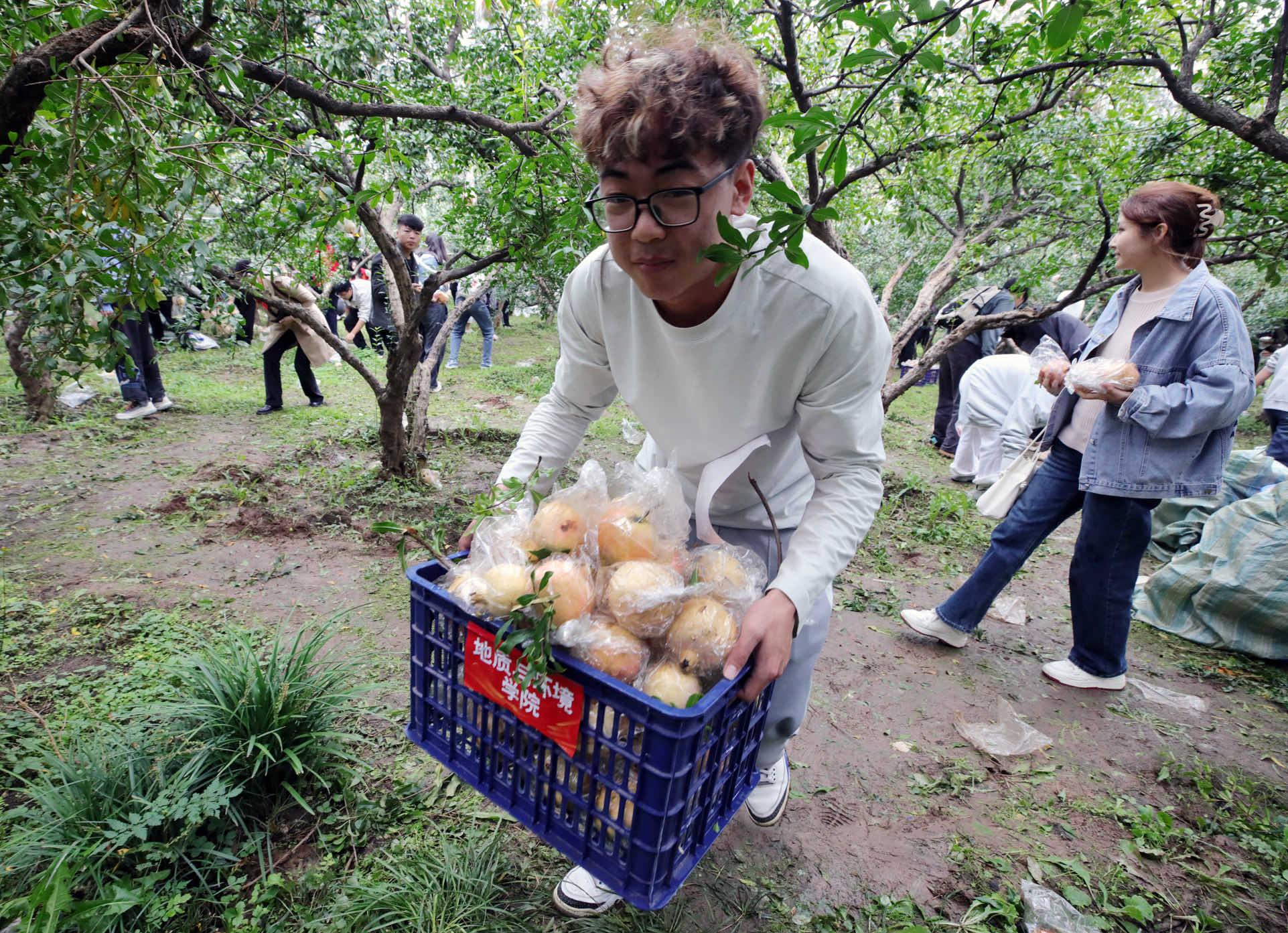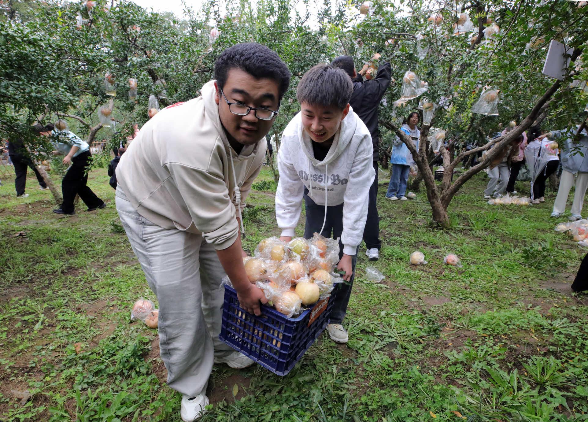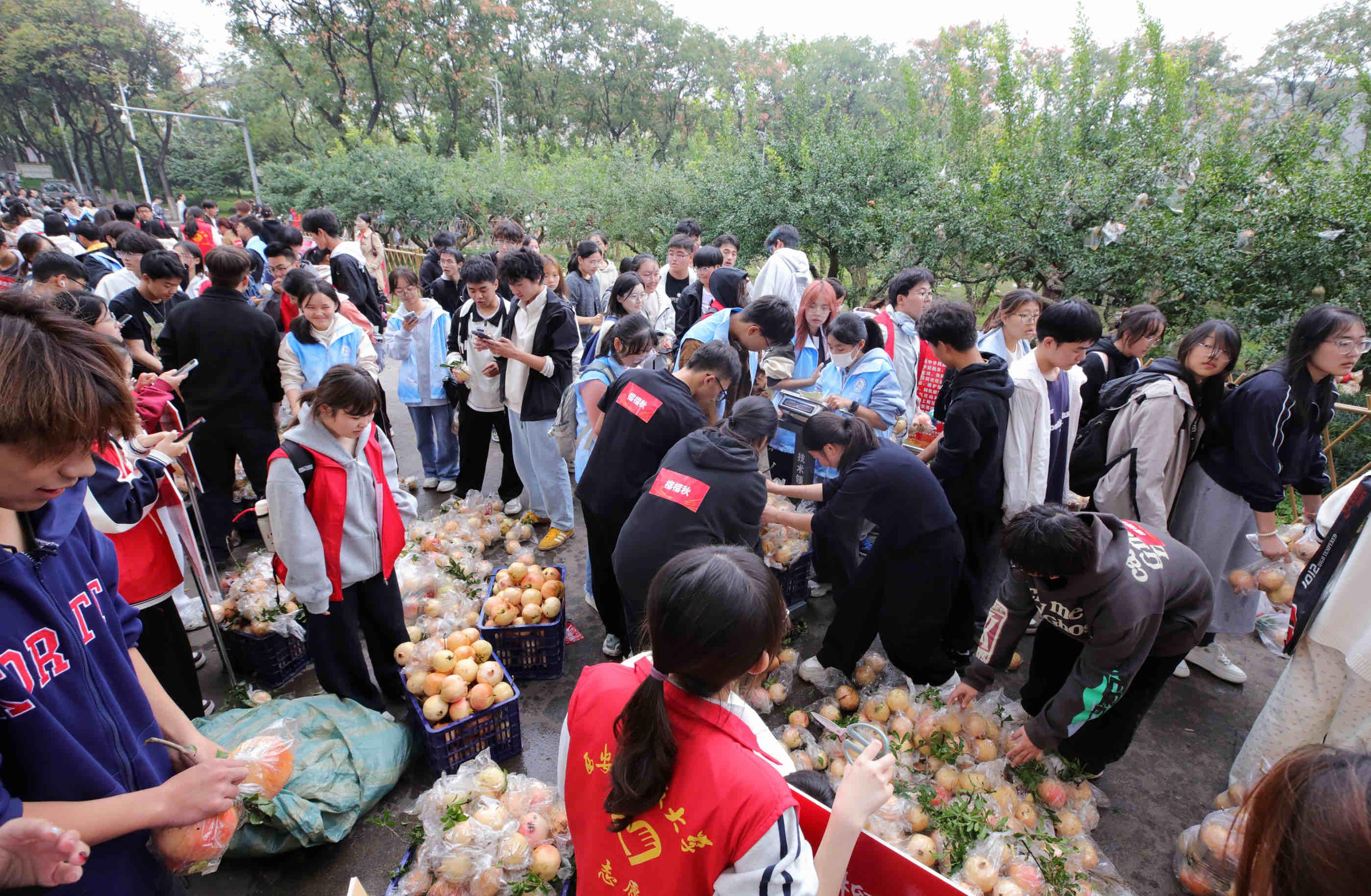“甜榴满仓队”“石来运转小分队”“码上石榴香”……一个个生动有趣的队名,映衬着大学生们的热情与创意。16个学院代表队与16个班级代表队穿梭在石榴树下,尽管雨后园内泥泞,石榴套袋中积有雨水,但大家毫不在意,专注地采摘着枝头饱满的果实。机械工程学院大一新生孙柯一边小心翼翼地摘着石榴,一边兴奋地说:“我家在蒲城,摘过酥梨,但摘石榴还是第一次,这种体验太特别了!”他的同学杨伟奇则捧着刚摘下的两个“石榴王”,兴奋地表示要带给未到场的同学和老师,“也让父母看看我在学校的丰收喜悦!”
