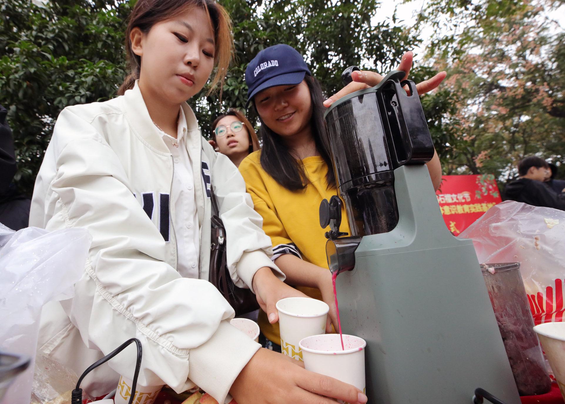 来自湖南的马克思主义学院学生罗聪玲,此刻也褪去了平日的文静,麻利地爬到树杈上采摘,将一颗颗饱满的石榴递到树下伙伴手中。“家乡没有石榴园,来西安上学后才发现它这么常见,校园里的这片石榴园更是让我大开眼界。”她说道。而人工智能与计算机学院的高婧怡则与同学们现场榨起了石榴汁,三人举杯共饮,用镜头记录下这份属于劳动者的甘甜:“自己动手摘的石榴,汁都格外甜!”