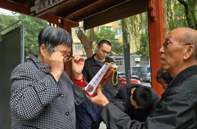 在免费配老花镜区,志愿者通过便携式验光设备,为老年居民逐一检测视力、确定度数,根据验光结果推荐合适的镜片与镜架,让居民“足不出社区”就能享受到专业的视光服务。