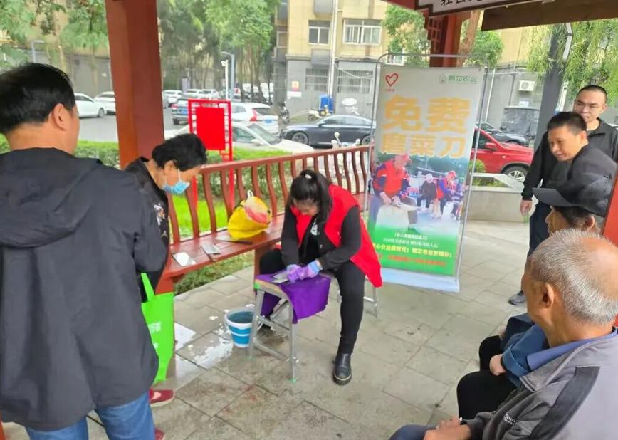 在磨刀区,粮芯农业的志愿者将居民带来的旧菜刀逐一接过,只凭一块磨得光滑的磨刀石,便熟练地开工——先顺着刀刃方向细细打磨去锈,再调整角度反复研磨开刃,动作细致又专注。原本切菜费力卷边的刀具,经过志愿者的手,很快就恢复了锋利,不少居民当场试切,都笑着说“跟新的一样好用”。志愿者还不忘叮嘱居民,日常用完刀具要擦干,避免生锈影响锋利度。
