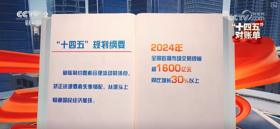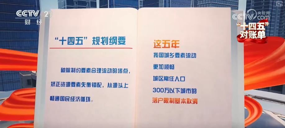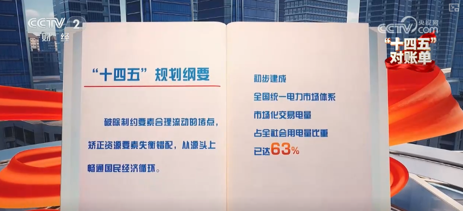 “十四五”规划纲要提出,破除制约要素合理流动的堵点,矫正资源要素失衡错配,从源头上畅通国民经济循环。这五年,我国城乡要素流动更加顺畅,城区常住人口300万以下城市的落户限制基本取消。劳动力、资本、数据等要素跨区域流动更加高效。2024年,全国数据市场交易规模超1600亿元,同比增长30%以上。初步建成全国统一电力市场体系,市场化交易电量占全社会用电量比重已达63%。