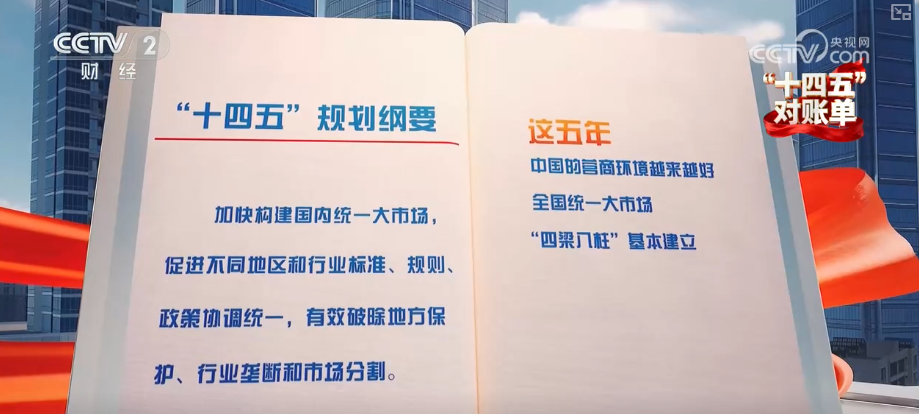 “十四五”规划纲要提出,加快构建国内统一大市场,促进不同地区和行业标准、规则、政策协调统一,有效破除地方保护、行业垄断和市场分割。这五年,中国的营商环境越来越好,全国统一大市场“四梁八柱”基本建立。