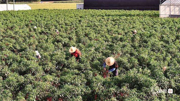9月30日,在岐山县省级现代农业产业园,工人在陕西岐稷隆盛农业科技有限公司位于凤鸣镇的蔬菜基地里采摘黄瓜、辣椒。“这里的蔬菜不使用化肥,按照绿色产品的标准进行种植,绿色健康、品质好。我们种植的黄瓜最近供不应求。”公司负责人牛亚辉告诉记者,“绿色生产方式较传统灌溉节水60%,公司还在基地开展测土配方施肥和绿色防控技术应用,推动农业生产提质增效。”