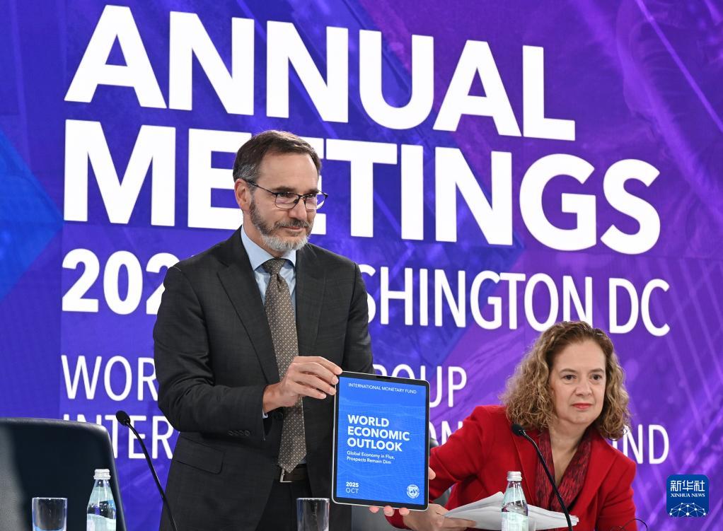 10月14日,在美国华盛顿,国际货币基金组织首席经济学家皮埃尔-奥利维耶·古兰沙(左)在《世界经济展望报告》新闻发布会上展示报告。新华社记者 李睿 摄