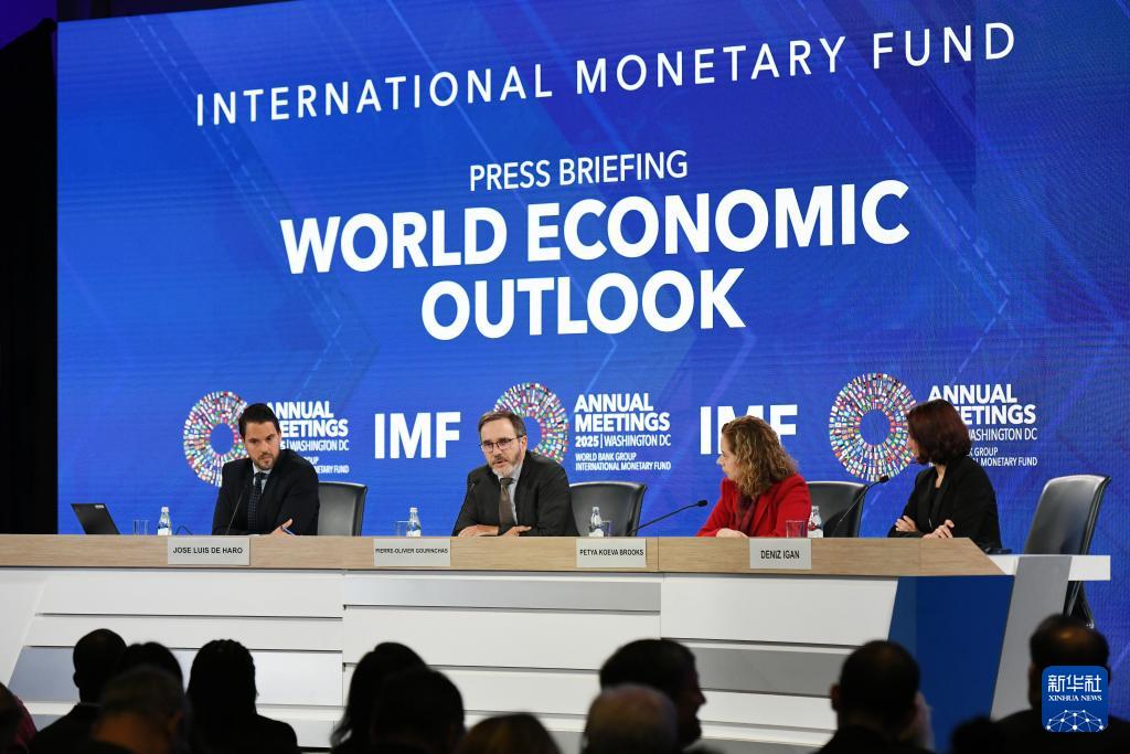 10月14日,在美国华盛顿,国际货币基金组织首席经济学家皮埃尔-奥利维耶·古兰沙(中)在《世界经济展望报告》新闻发布会上讲话。新华社记者 李睿 摄
