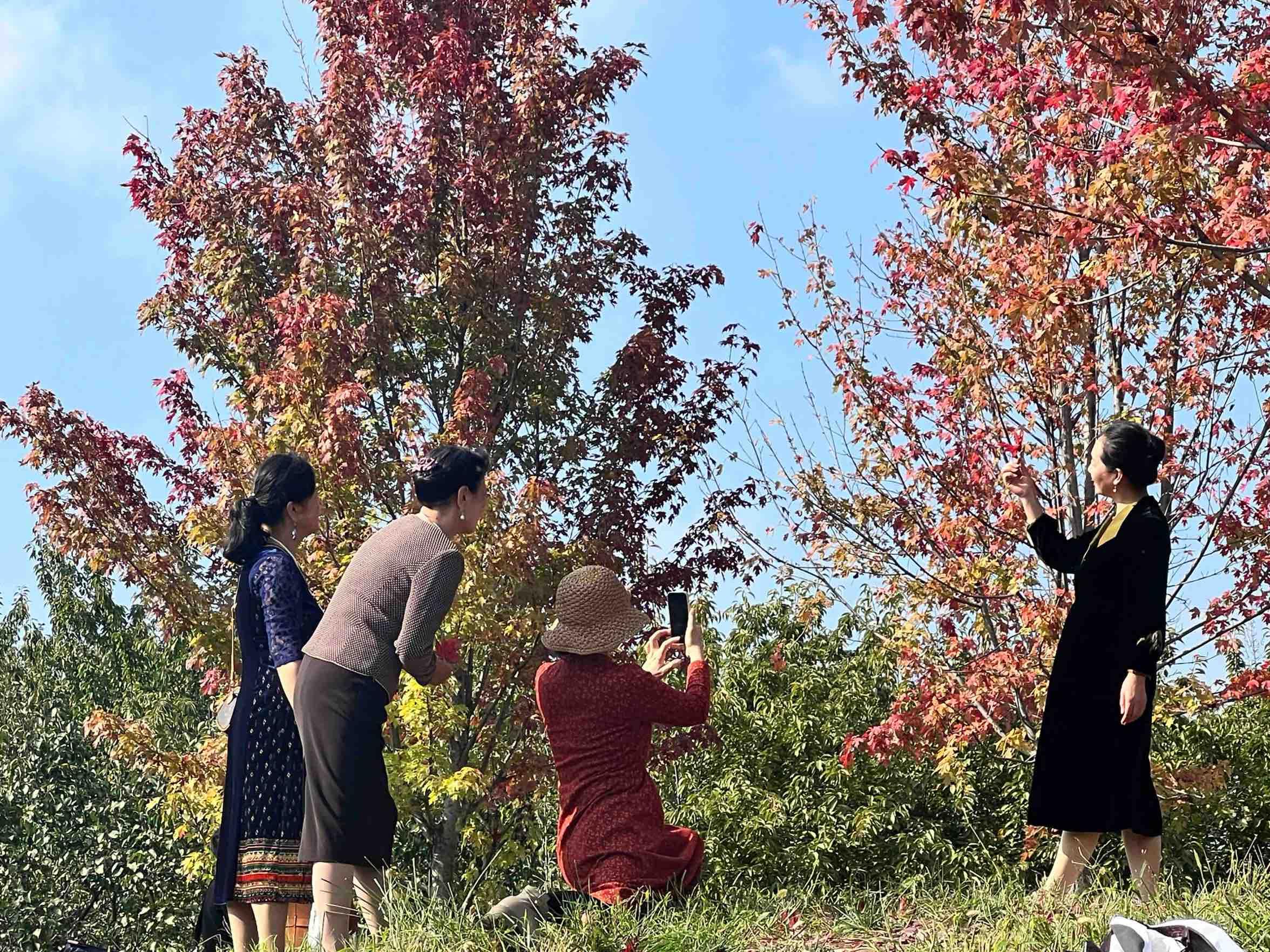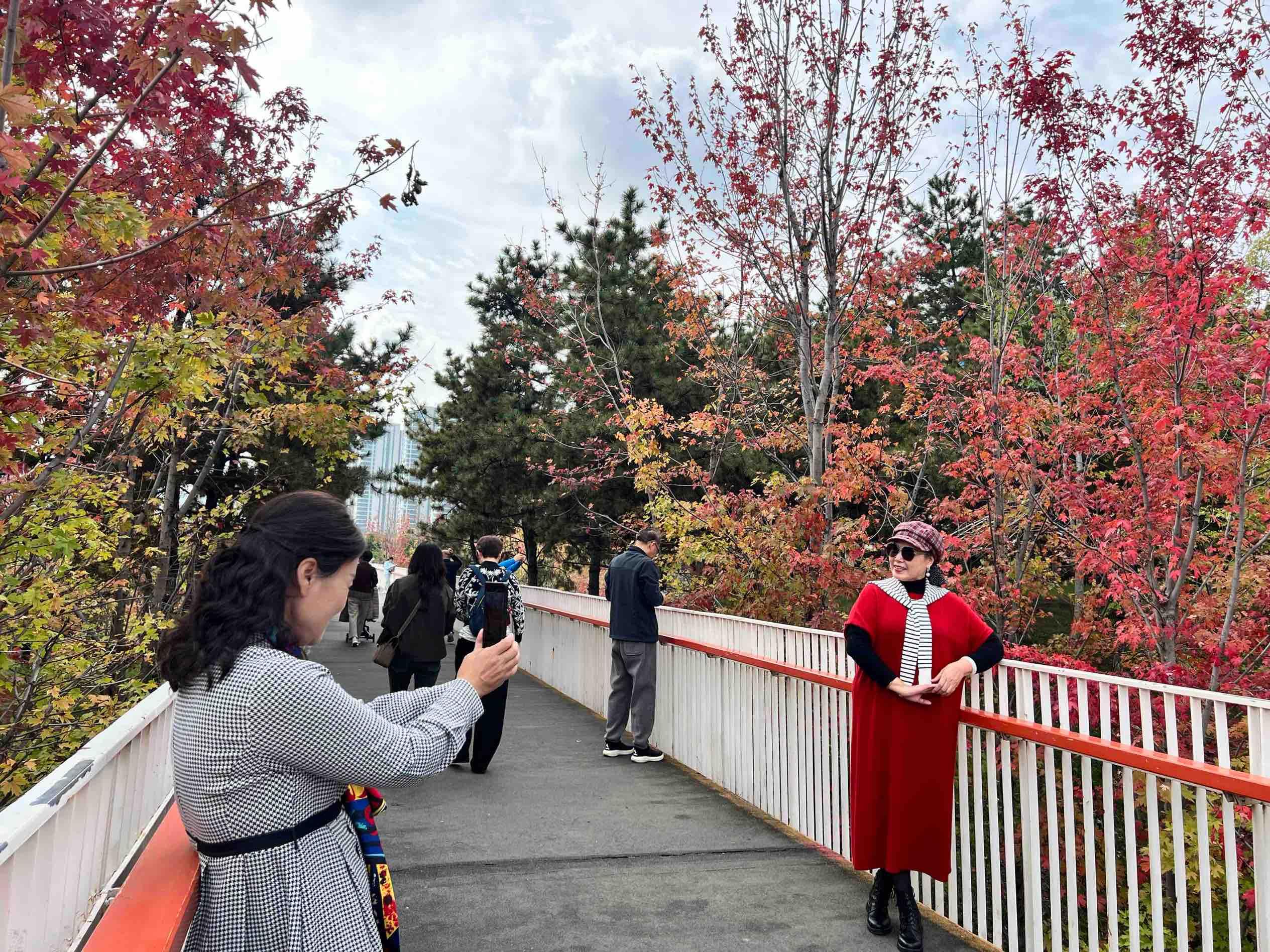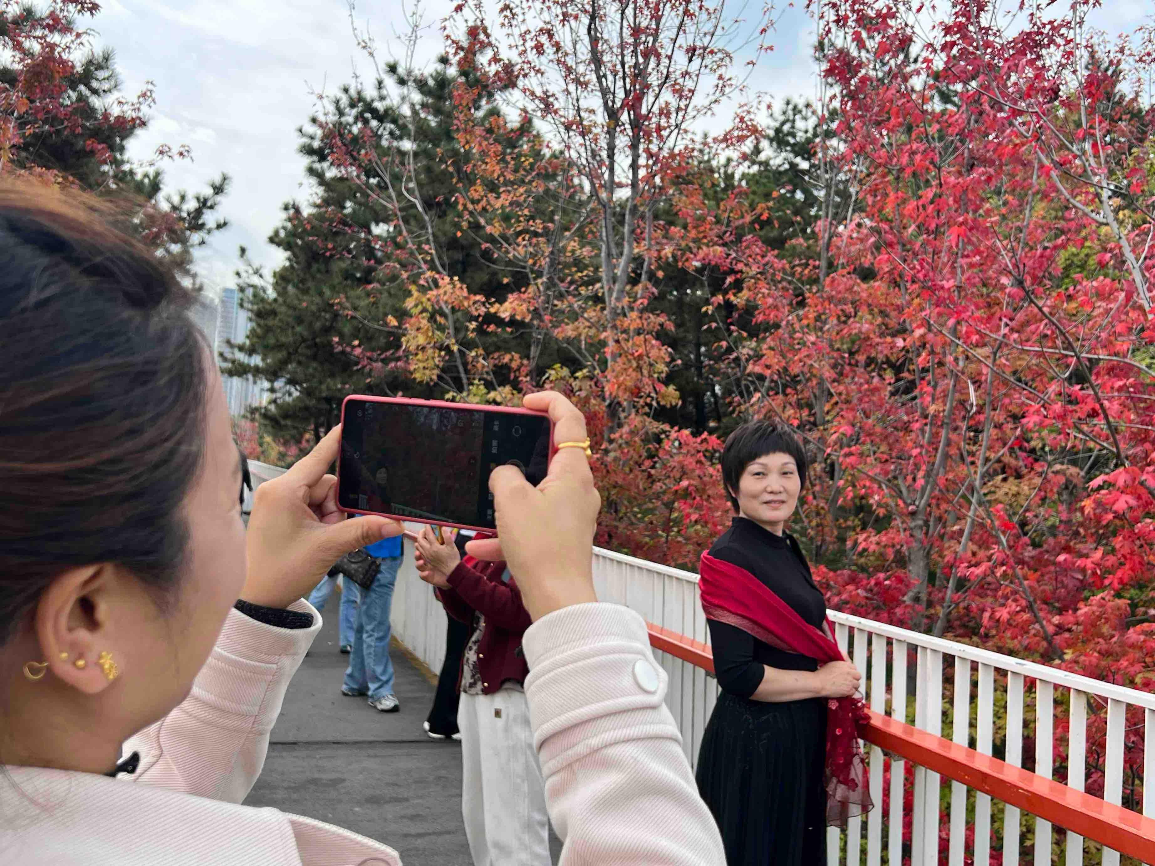午后,公园入口人流从各处汇入。红枫林下,最先响起的是快门声。“快帮我拍张照,这枫叶太美了!”一位阿姨在姐妹团的手机镜头前笑声朗朗。姐妹团你一摆手、我一转身,丝巾在秋风里飞舞,像一道亮丽的风景线。旁边,市民张女士一边给家人拍照,一边感慨:“再不出来晒晒,人都要‘发霉’了!”游客们或摆姿势拍照,或在落叶中打滚,整个枫林充满笑声和活力。