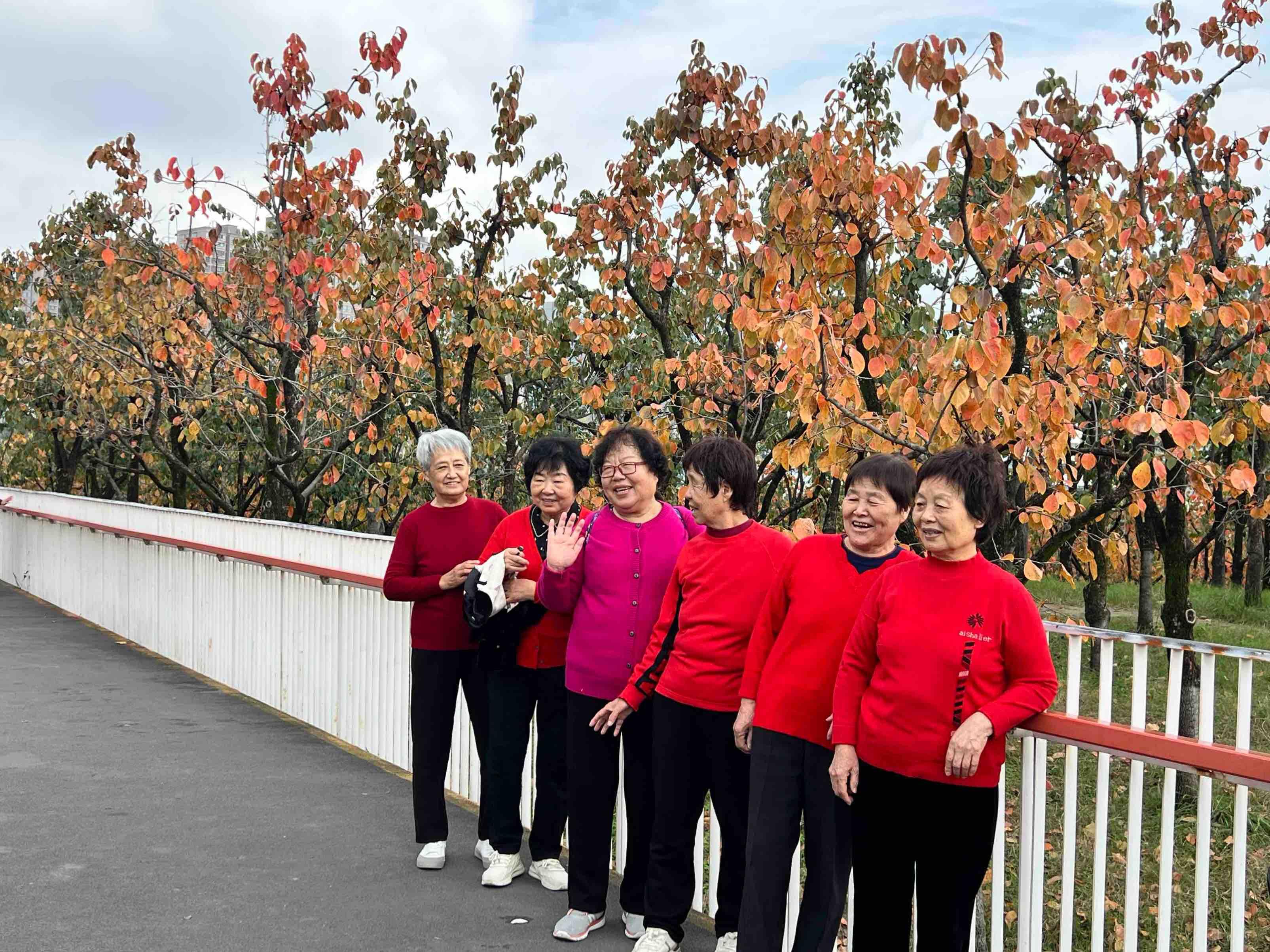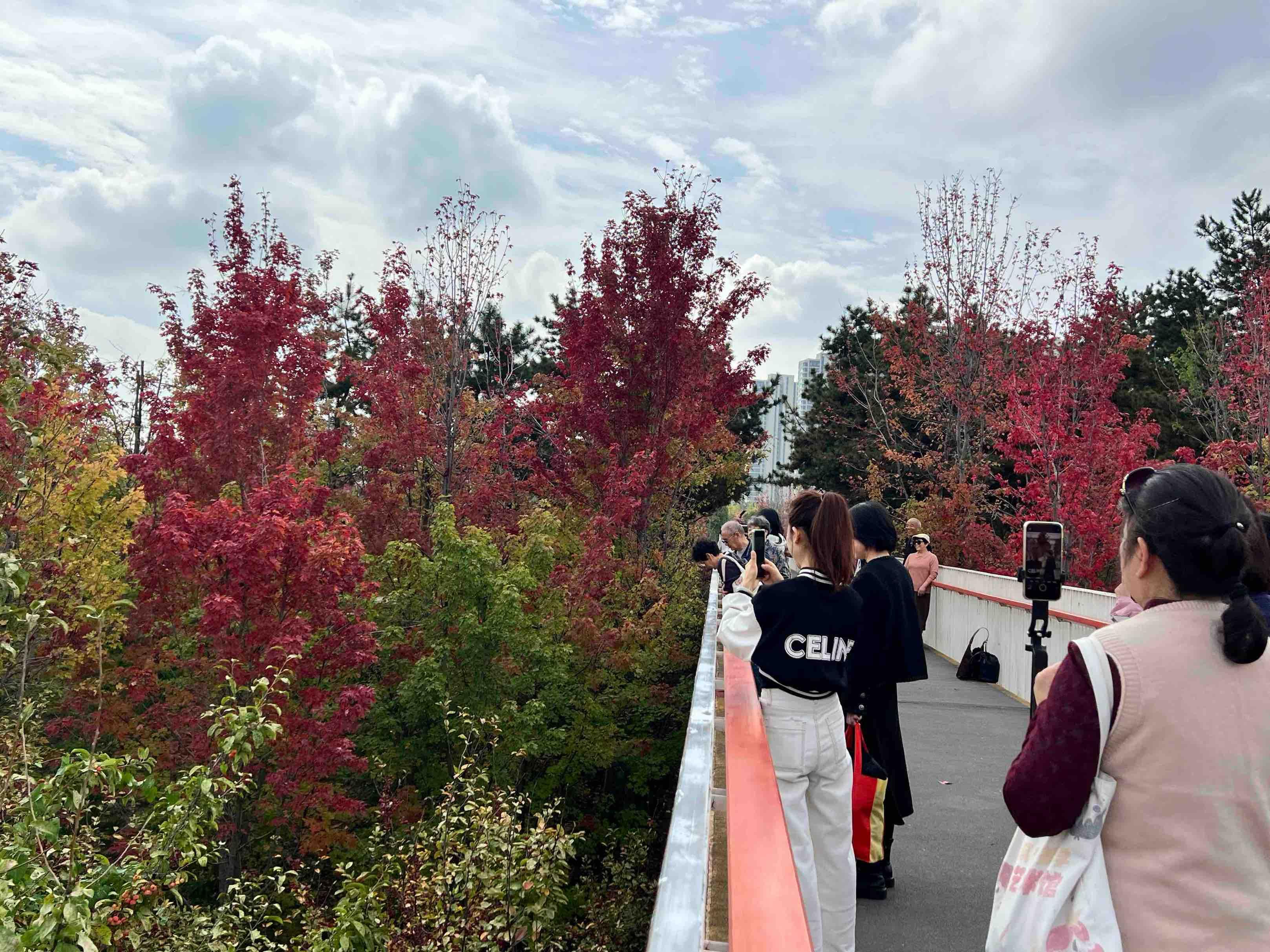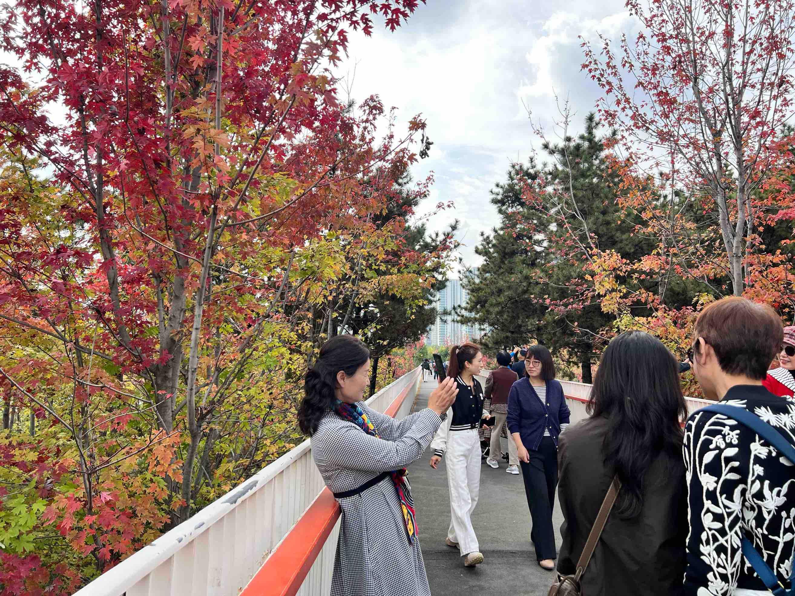 午后,公园入口人流从各处汇入。红枫林下,最先响起的是快门声。“快帮我拍张照,这枫叶太美了!”一位阿姨在姐妹团的手机镜头前笑声朗朗。姐妹团你一摆手、我一转身,丝巾在秋风里飞舞,像一道亮丽的风景线。旁边,市民张女士一边给家人拍照,一边感慨:“再不出来晒晒,人都要‘发霉’了!”游客们或摆姿势拍照,或在落叶中打滚,整个枫林充满笑声和活力。