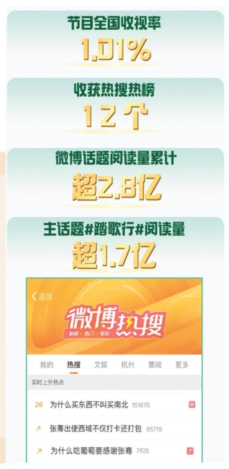 一系列生动有趣、贴近年轻受众的话题持续发酵,如#踏歌行古丝绸之路起点西安#、#为什么吃葡萄要感谢张骞#、#张骞出使西域不仅打卡还打包#、#没想到古人在骆驼上巡回演出#等,以轻松幽默的语态解读厚重历史,成功登上微博多类榜单,引发广泛共鸣。