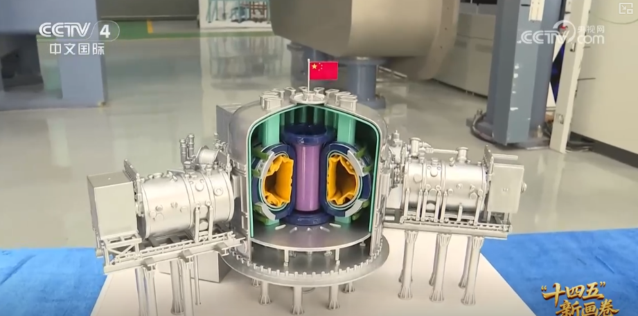 这个“人造太阳”的模型,“橘子瓣”以后会安装在主机的中间位置,整个主机里一共有8个“橘子瓣”,全部装上后会形成一个环形的真空室,相当于聚变反应的“锅炉”。未来,从海水里面提取的氘、氚元素就是在这样的“锅炉”里进行聚变反应,产生源源不断的清洁能源。目前,下一代“人造太阳”正在进行关键部件的研制和现场集成调试,将在2025年年底全面建成。