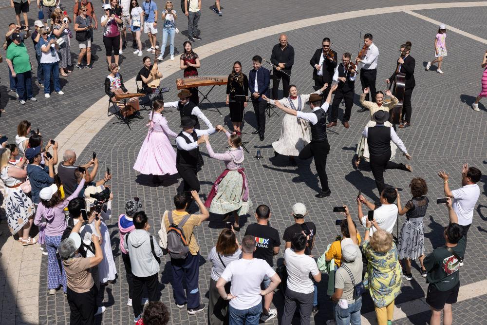 6月14日,为庆祝首个文明对话国际日,“对话·知音”文明对话国际日主题活动在匈牙利首都布达佩斯举行。图为中匈艺术家在城市快闪音乐活动上表演。新华社发(弗尔季·奥蒂洛摄)