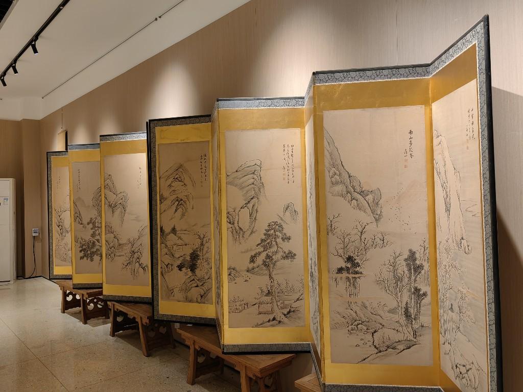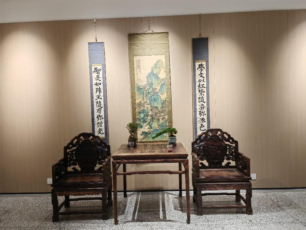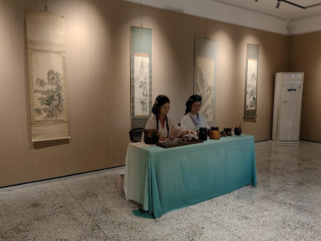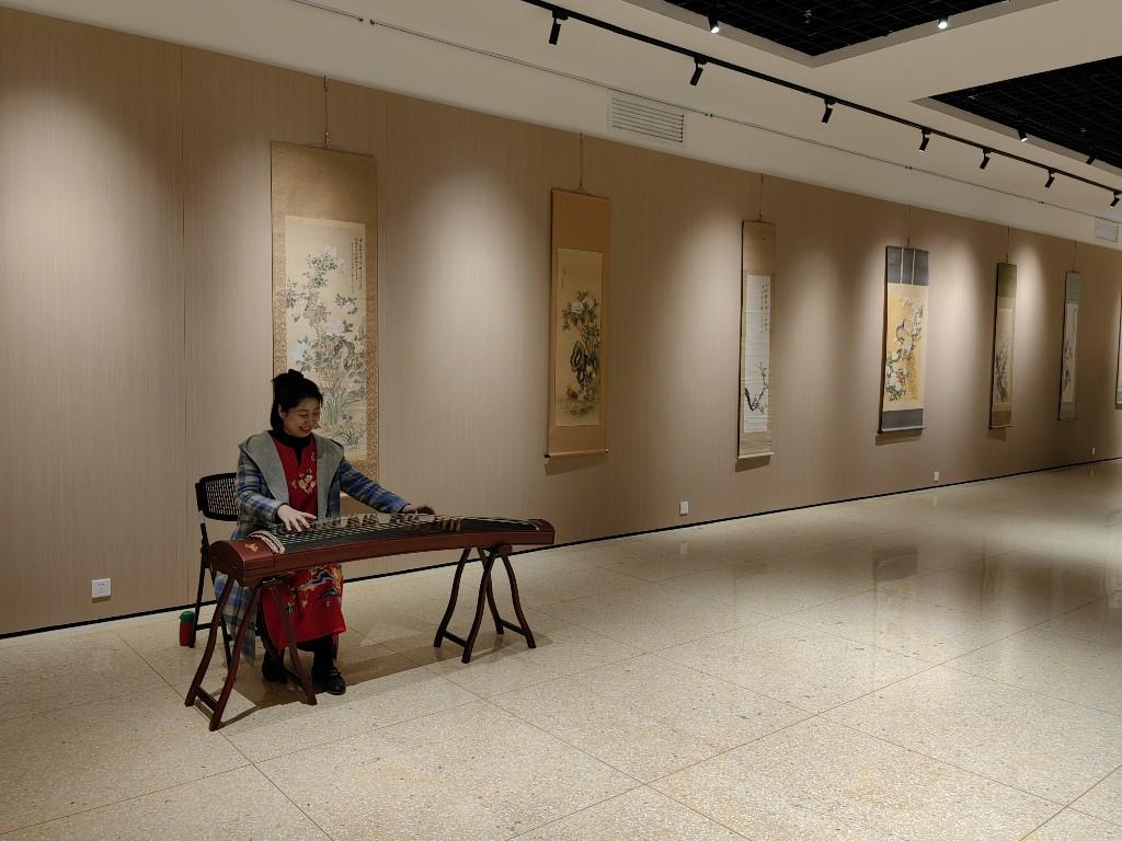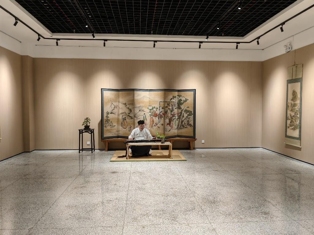 展览以“林泉高逸”“四时生机”“禅定智慧”三大主题篇章,系统展示了古代茶挂精品。空间中,清雅乐音随步移景异——小厅内古琴声悠远绵长,大厅中板胡与古筝依次奏响,为静态书画注入了生动的韵律。