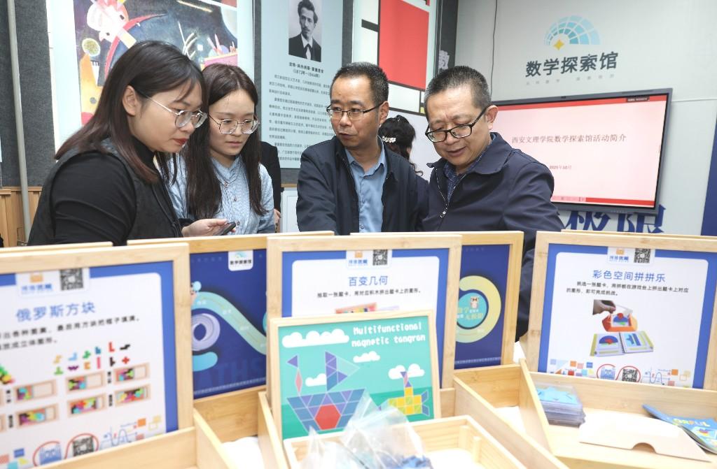 西安文理学院数学探索馆由西安文理学院师范学院联合西安经济数学学会数学文化教育专委会和陕西博雅教育研究院于2025年6月共建而成。探索馆在满足师范学院日常教学需求的同时,利用节假日面向社会免费开放。试运行期间,已迎来陕西师范大学、上海师范大学、内蒙古师范大学等高校的参观,接待校外体验者500余人次。