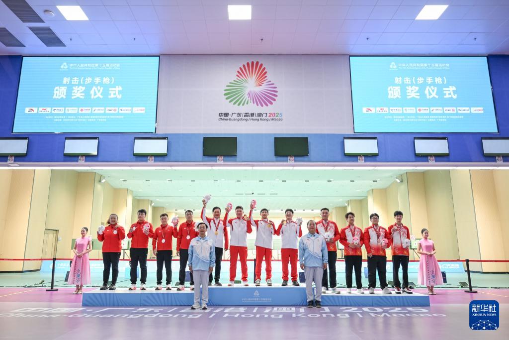 当日,第十五届全运会射击男子10米气手枪团体决赛在广州举行。