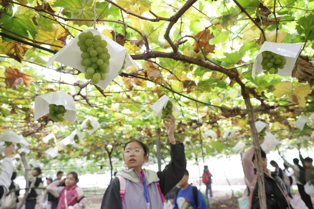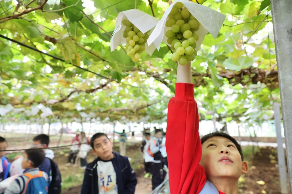 藤架下,一串串饱满的葡萄如玛瑙般垂挂,散发着诱人的果香。在导师的指导下,孩子们学习了如何辨别葡萄的成熟度,并用小剪刀小心翼翼地剪下最中意的那一串。他们穿梭在藤蔓之间,相互协作,比一比谁找到的串形更美,谁摘的果实更甜。欢声笑语在田间回荡,亲手采摘的果实显得格外香甜,这份沉甸甸的收获,让秋日的丰盈变得真实可感。