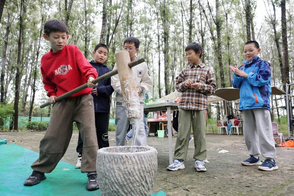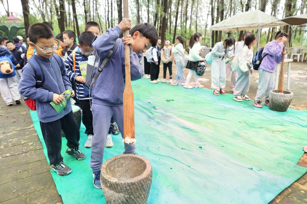 收获的喜悦还在延续,另一边,传统的打糍粑活动也吸引了众多同学。他们围在石臼旁,看着蒸熟的糯米被倒入其中,纷纷跃跃欲试。在导师的指导下,孩子们轮流上阵,手握沉重的木槌,喊着号子,你一锤我一锤地用力捶打。起初,动作还有些笨拙,糯米也显得有些“不听话”,但在齐心协力的反复捶打下,糯米逐渐变得绵软柔韧,融合成一个光滑的米团。
