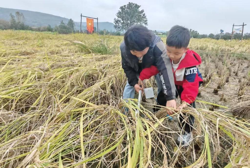 随后,孩子们来到金灿灿的稻田边,开启“收水稻”体验。面对沉甸甸的稻穗,孩子们既好奇又兴奋。在老师的示范下,他们学着握住稻秆,用小镰刀轻轻割下稻穗,再尝试用原始的方法分离稻谷与稻壳。“原来我们吃的米饭是这样来的!”孩子们一边擦着额头的汗水,一边发出感叹,深刻体会到“粒粒皆辛苦”的含义。