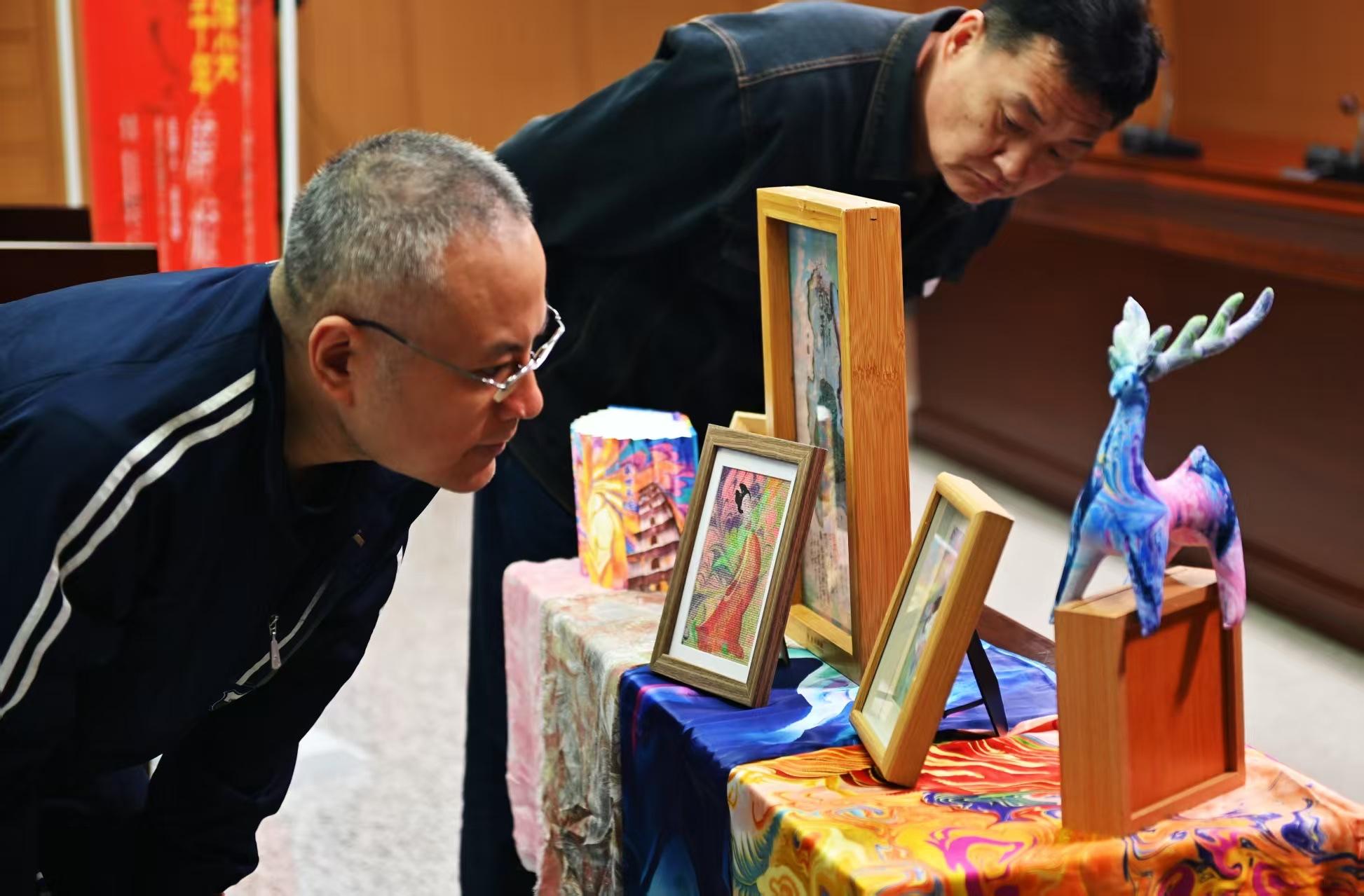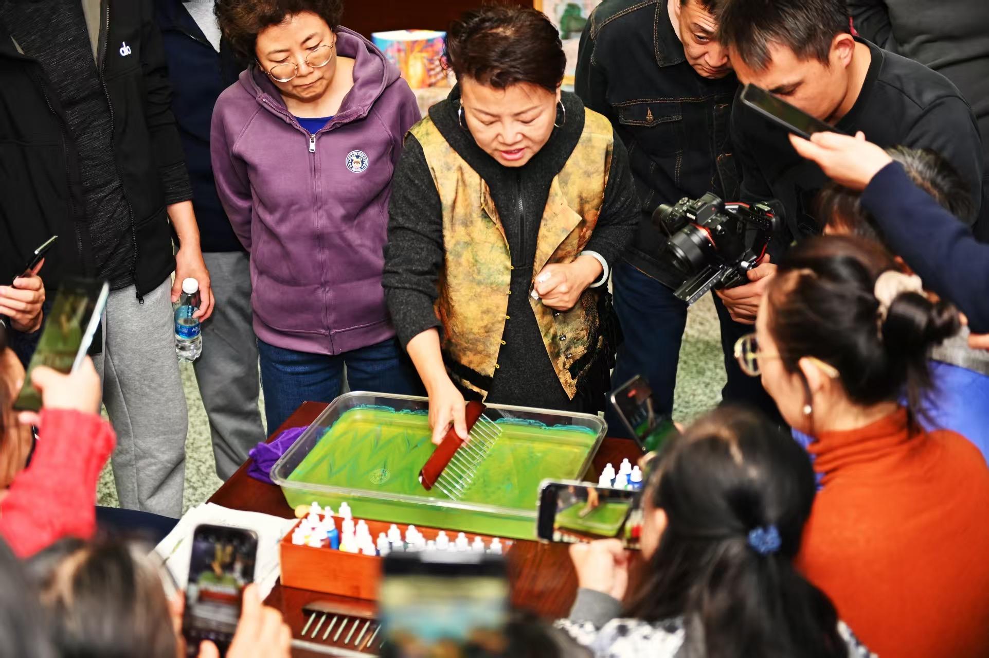 “唐流彩的魅力在于不可复制,就像每个人的人生都是独一无二的。”张双敏一边演示,一边向读者讲解其历史渊源与古法智慧。演示结束后,读者按组体验,张双敏逐组巡视指导,针对“色彩扩散过快”“拓印图案模糊”等问题,手把手帮助大家攻克难点。