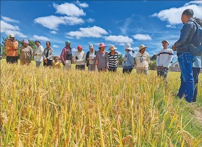 在位于马达加斯加首都塔那那利佛附近的中国国家杂交水稻工程技术研究中心非洲分中心试验田里,当地农业技术人员和水稻种植户查看作物长势。